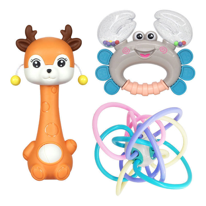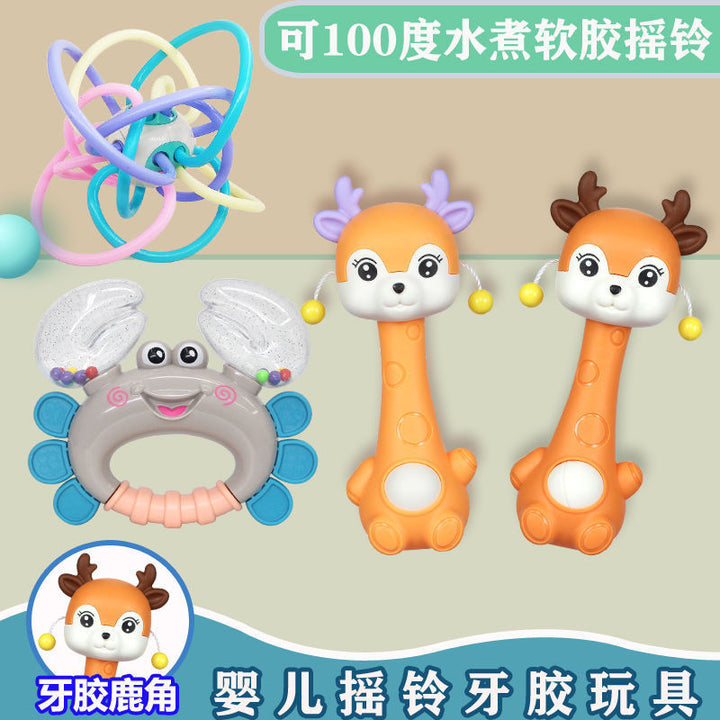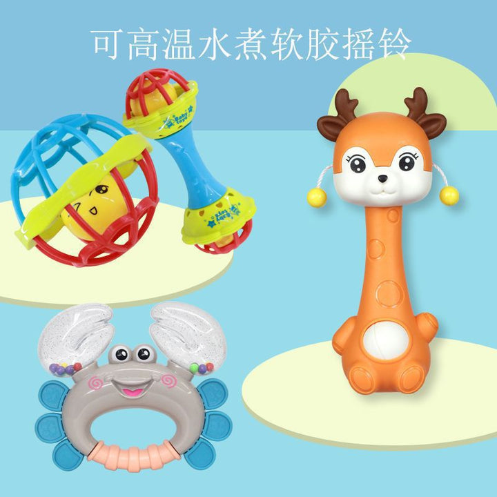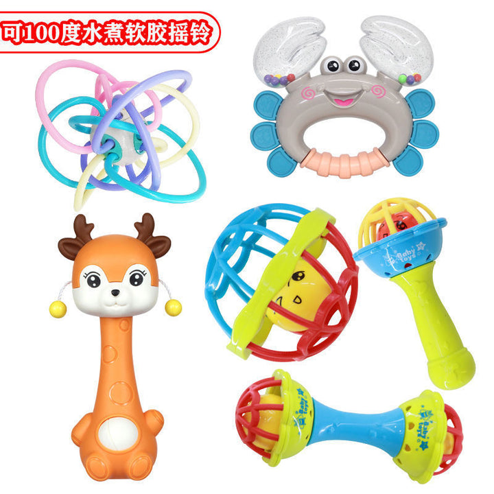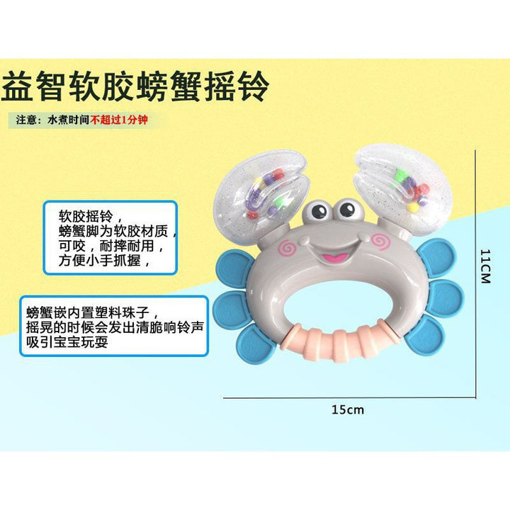 Deer rattle (random color), Single head rattle hammer (random color), Small exercise ball (9.5cm for a single pack) with random color, Double-headed rattle hammer (random color), Big crab rattle (random color), Toothpaste toy (macaron marine animal) color random |