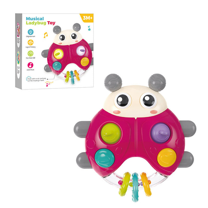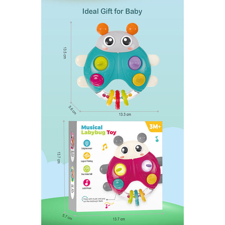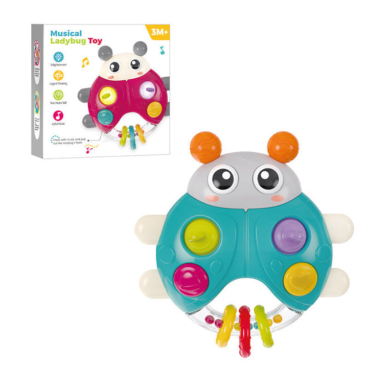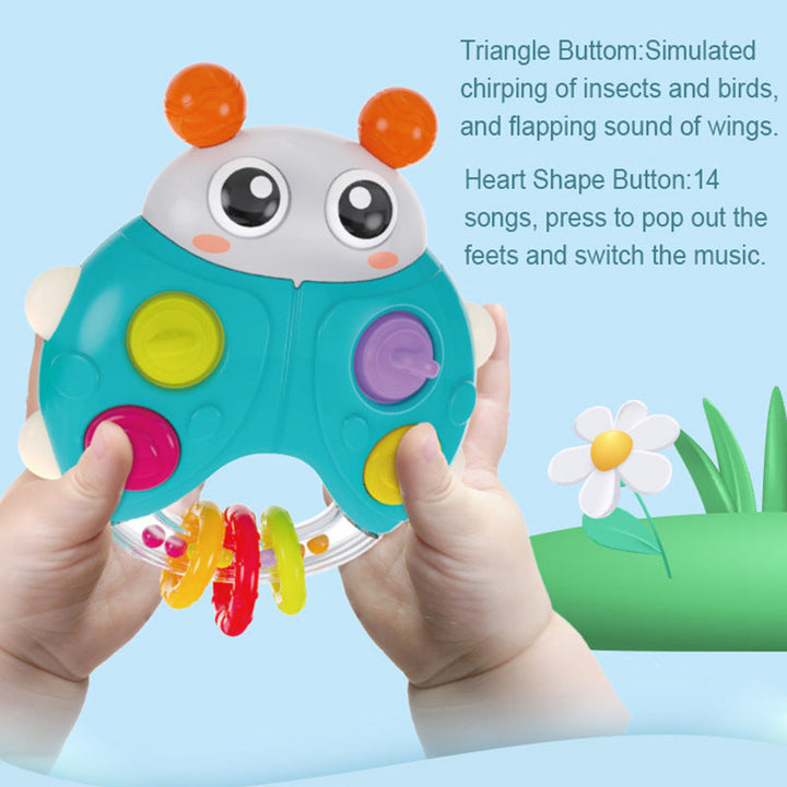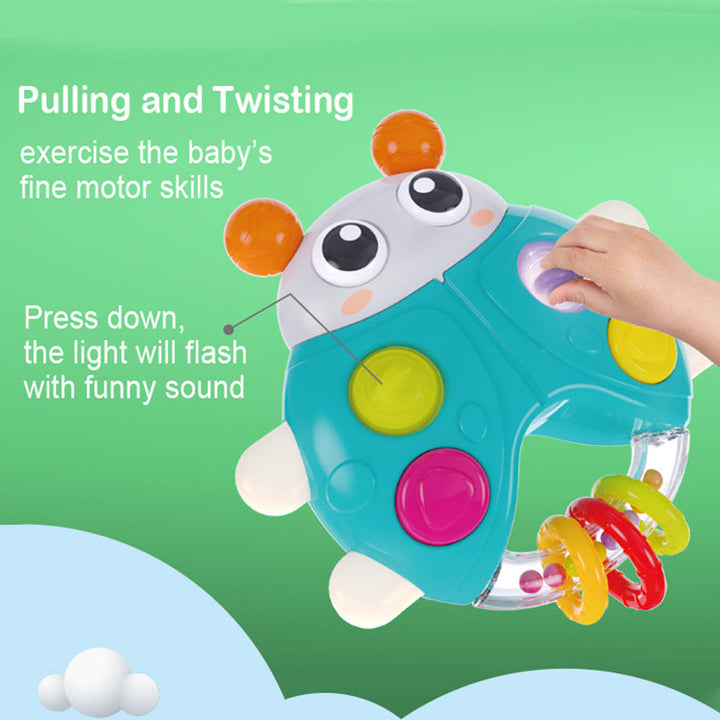 Cross-border export cartoon sound and light beetle hand rattle baby press music baby finger fine toy