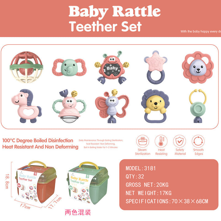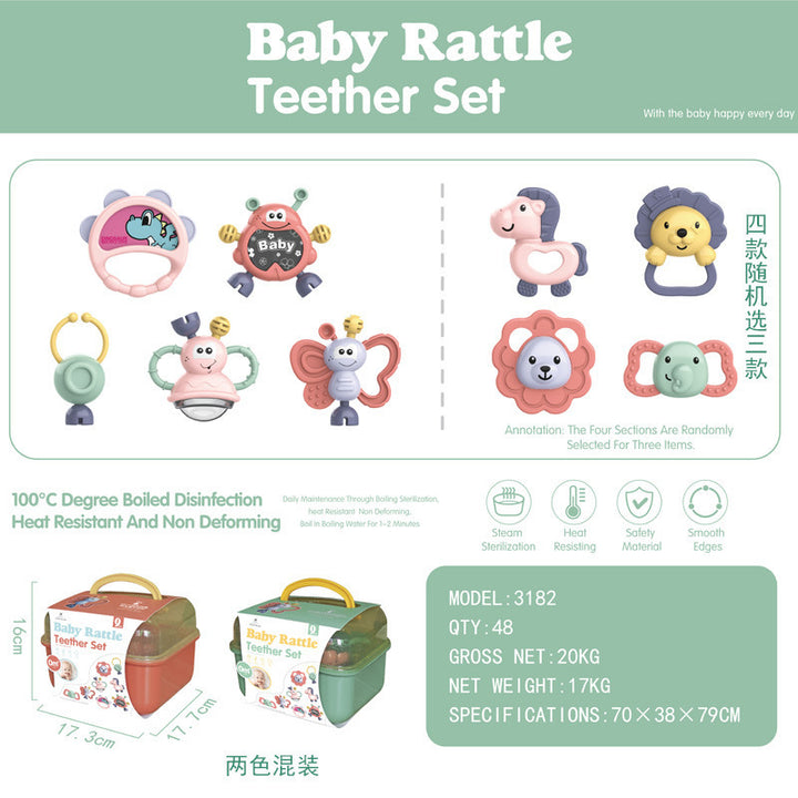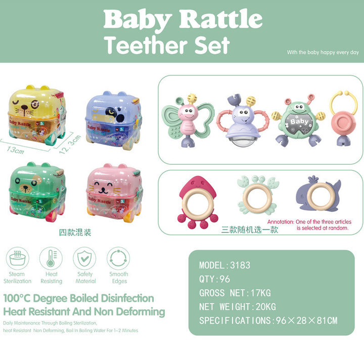 3183 Rattle 5-piece set of 96 boxes MOQ, 3182 Rattle 8-piece set 48 boxes MOQ, 3181 Rattle 10-piece set 32 boxes MOQ, 3183A rattle 4-piece set, minimum order of 200 sets in bags |