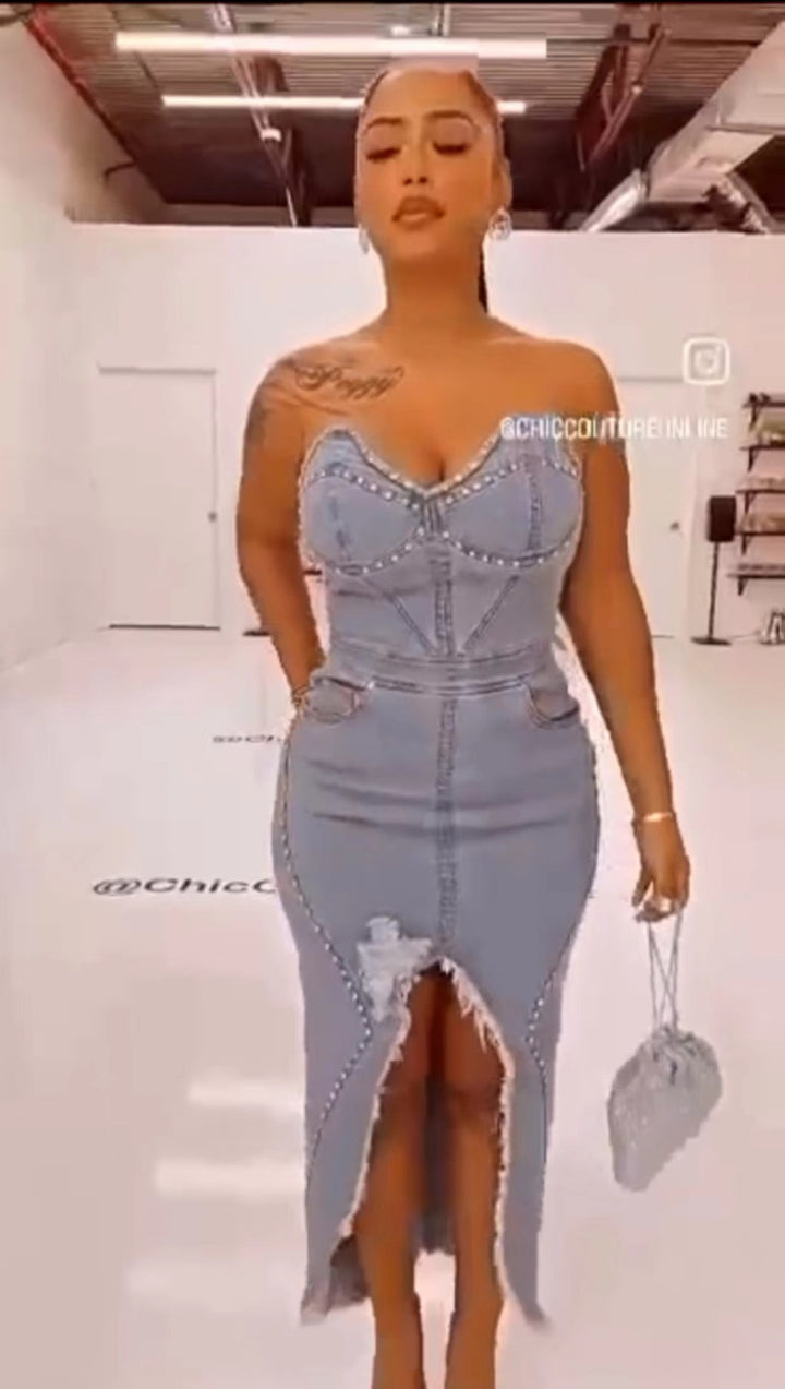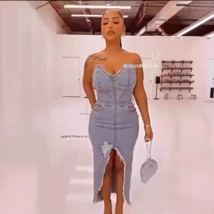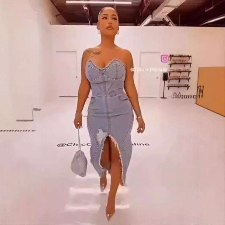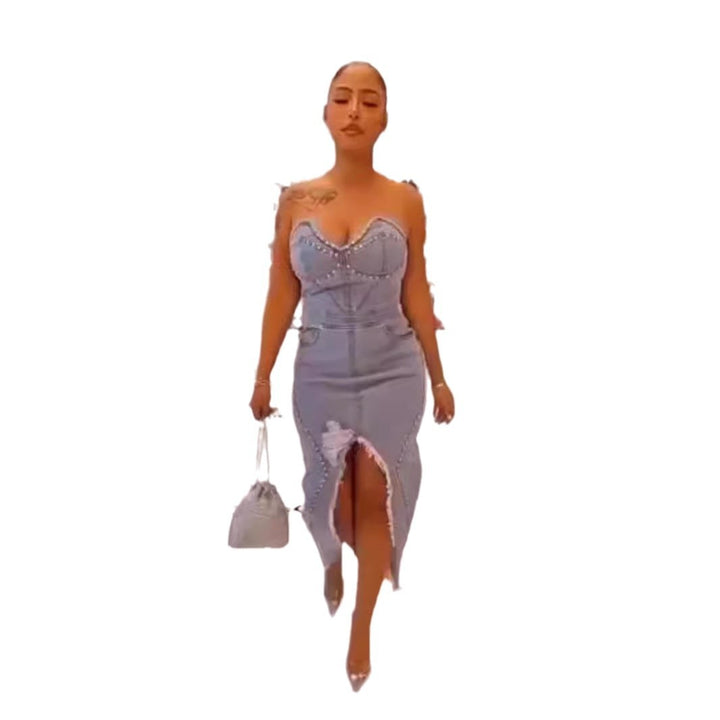 Cross-border new European and American washed denim dress hot drilling split fork grinding tube top sexy women's long dress