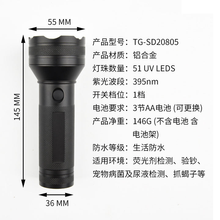 Cross-border wholesale 100 lamps UV fluorescent agent detection hand-held ultraviolet black technology scorpion purple light flashlight