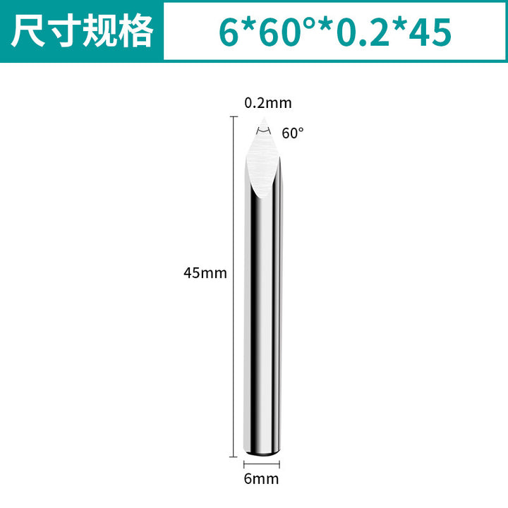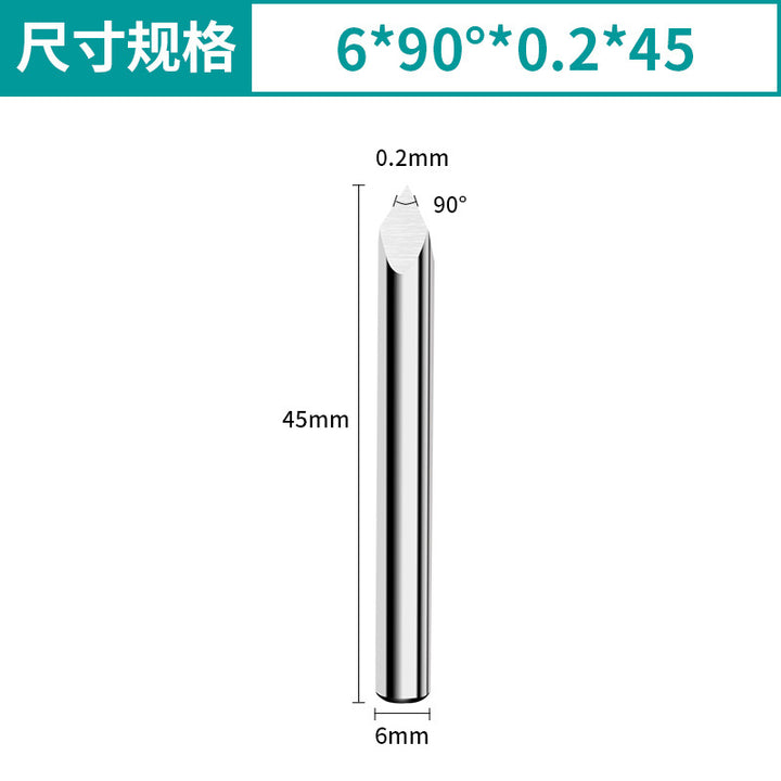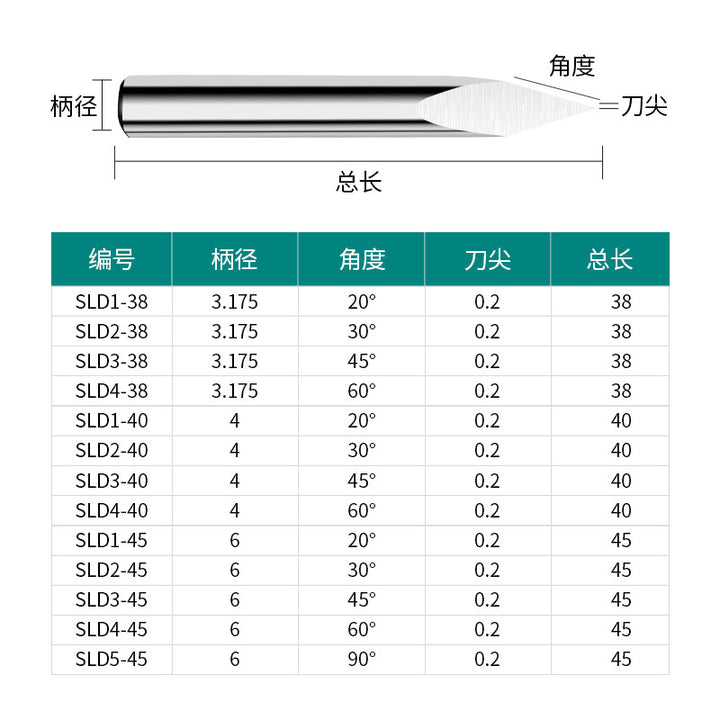 Shank diameter * angle * tip * total length, 3.175 * 20 ° * 0.2 * 38, 3.175 * 30 ° * 0.2 * 38, 3.175 * 45 ° * 0.2 * 38, 3.175 * 60 ° * 0.2 * 38, 4 * 20 ° * 0.2 * 40, 4 * 30 ° * 0.2 * 40, 4 * 45 ° * 0.2 * 40, 4 * 60 ° * 0.2 * 40, 6 * 20 ° * 0.2 * 45, 6 * 30 ° * 0.2 * 45, 6 * 45 ° * 0.2 * 45, 6 * 60 ° * 0.2 * 45, 6 * 90 ° * 0.2 * 45 |