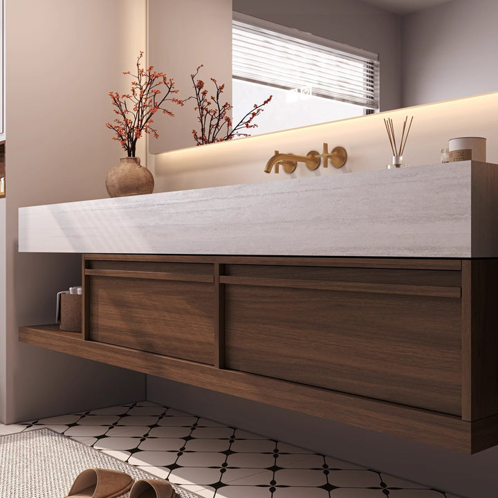 [Customized] Medieval style rock slab hot bending integrated basin bathroom cabinet hand wash...