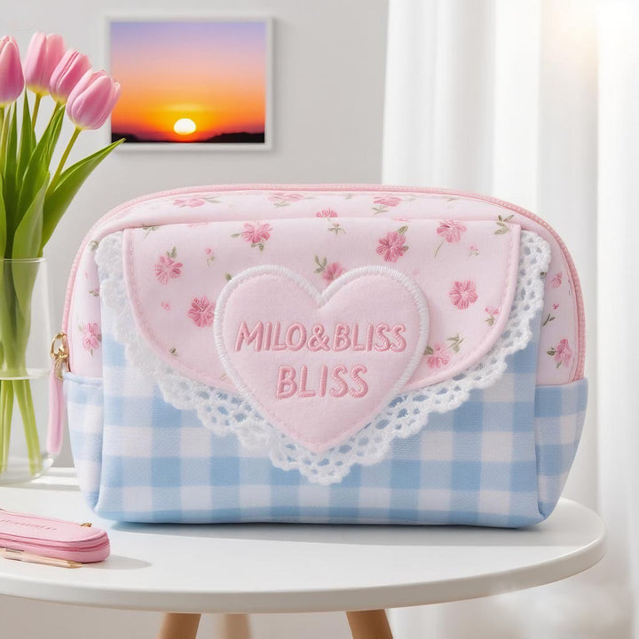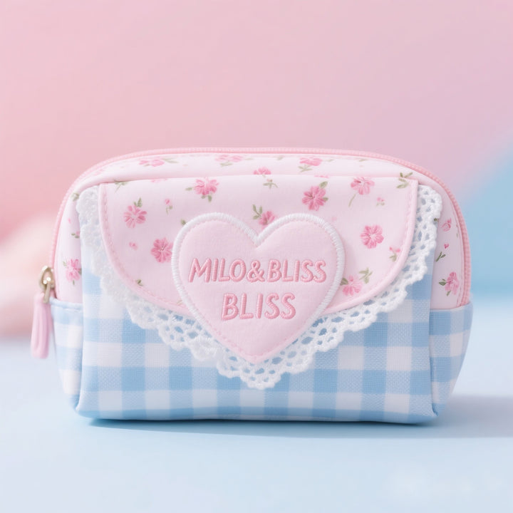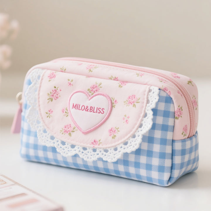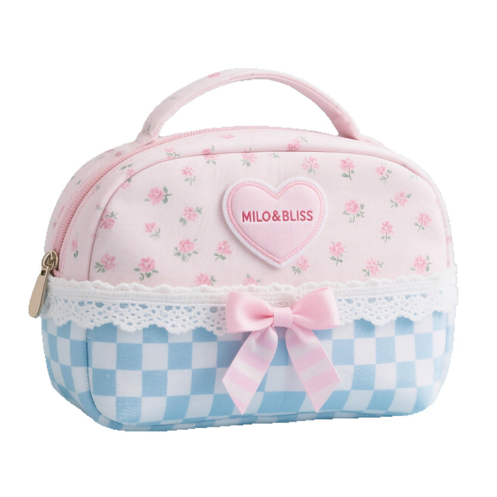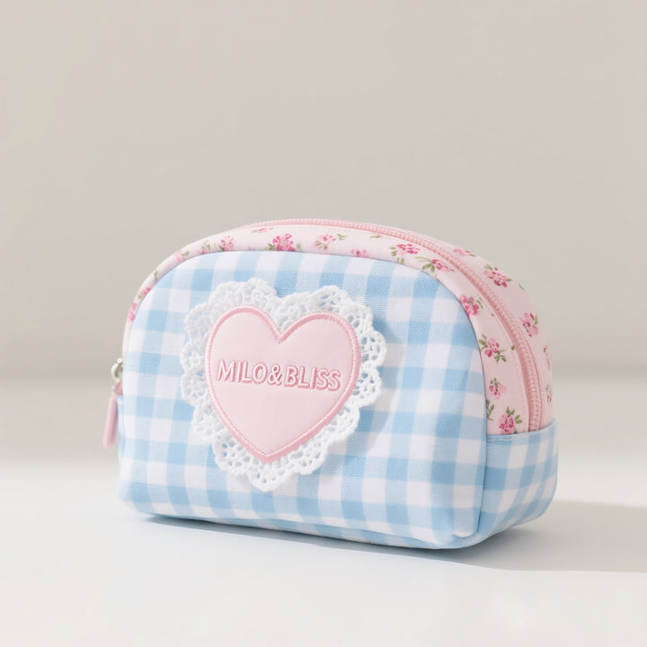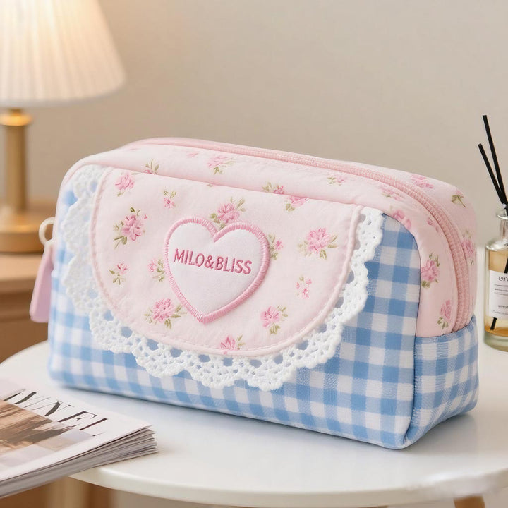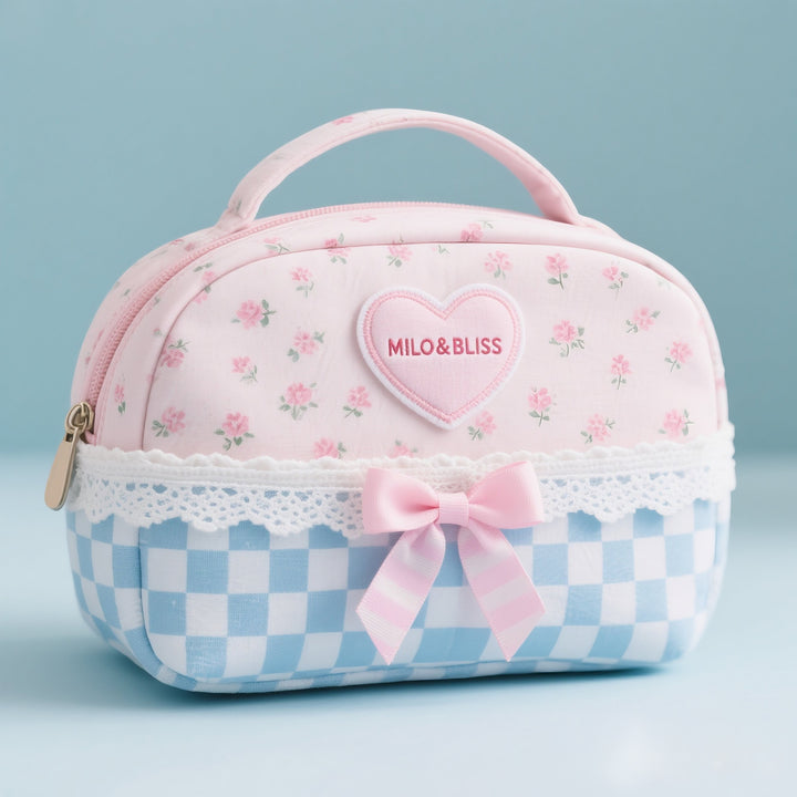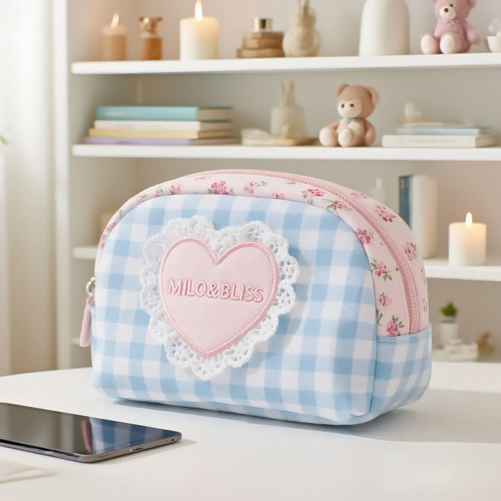 Customized pink and blue plaid love portable cosmetic bag sweet lace portable storage bag girl heart hand cosmetic bag
