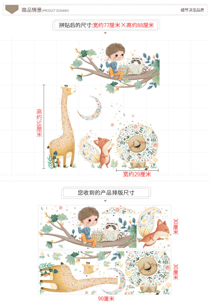 Cute cartoon sticker giraffe lion fox decorative sticker children's room kindergarten wall sticker big tree wall sticker