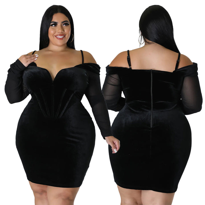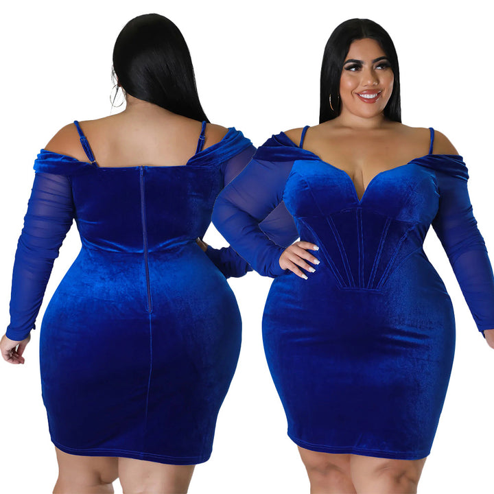 CY100195 European and American large-size velvet fabric dress, sexy V-neck hip-wrapped large-size skirt, perspective long-sleeved model.