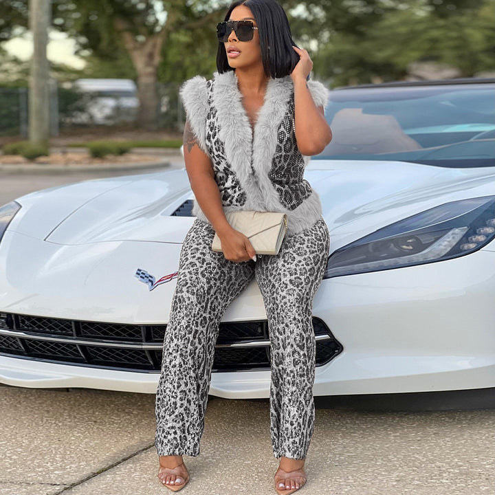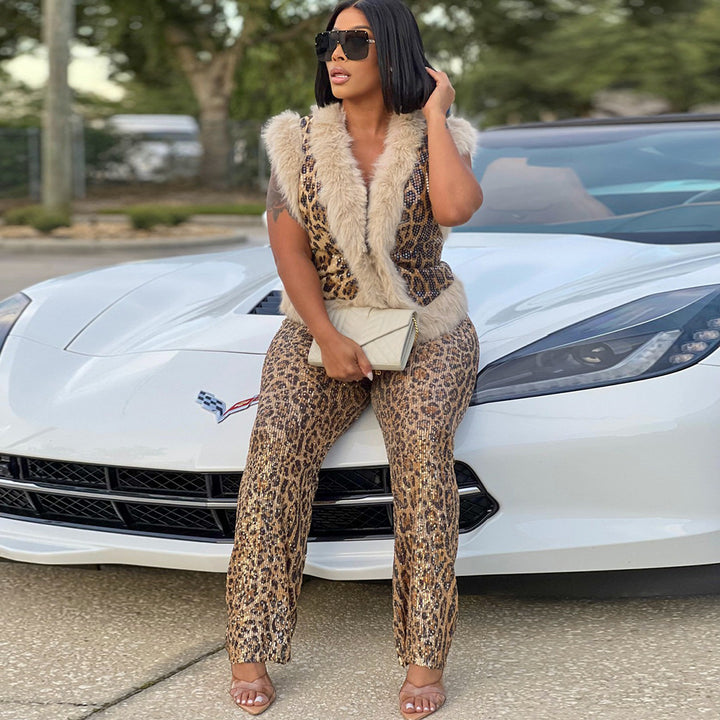 CY901569 Cross-border women's clothing casual fashion leopard print sequined two-piece set top sleeveless top slim trousers women