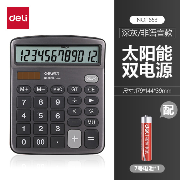 Deli 1653 large button solar dual power desktop calculator 12-bit widescreen financial office calculator