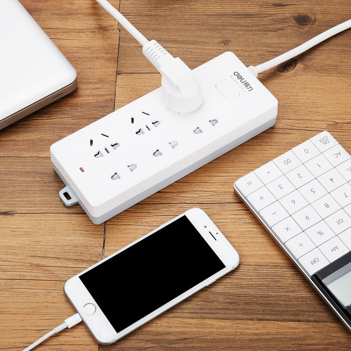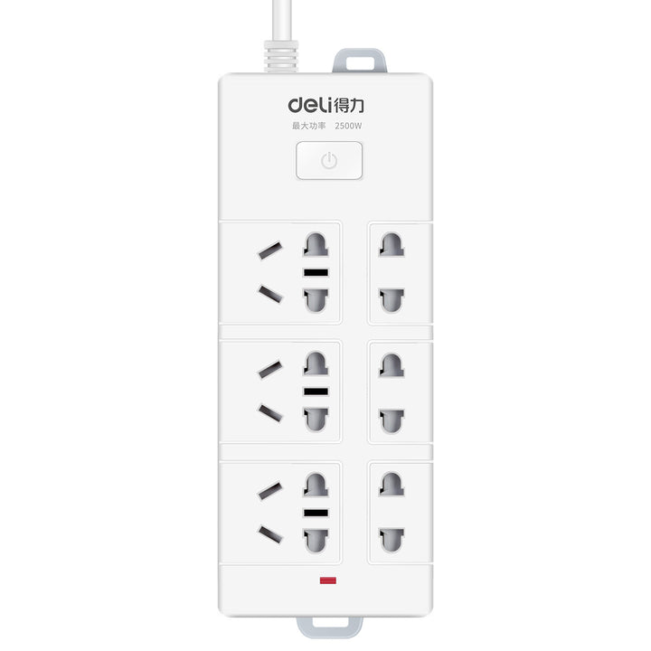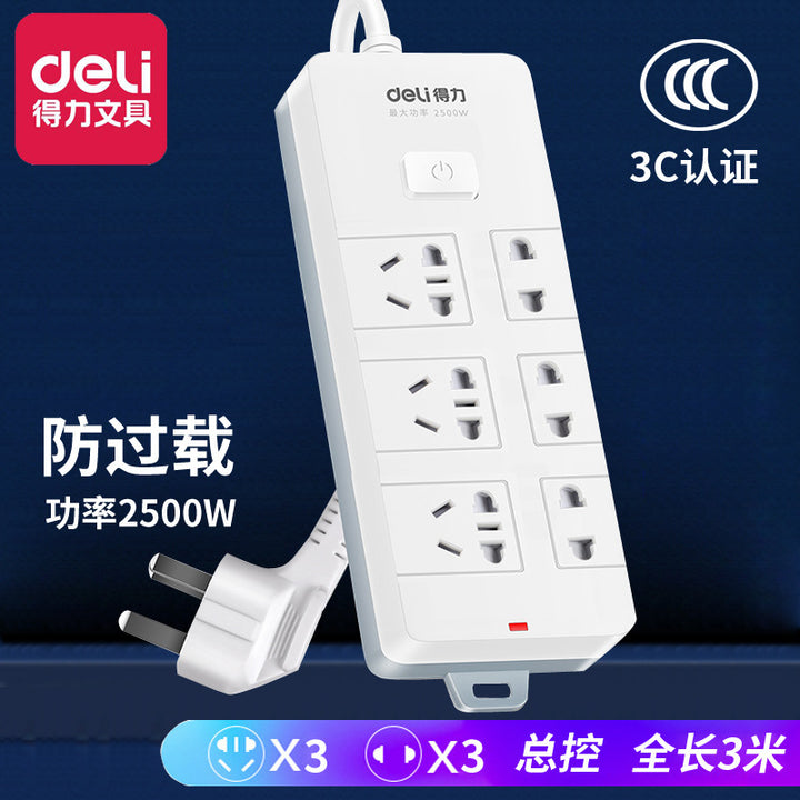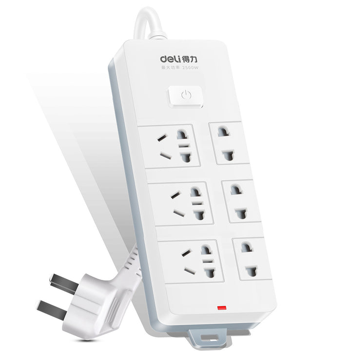 Deli 18256 socket 6-bit cable length 3 meters plug-in white board surface household power strip wholesale power cord plug-in row