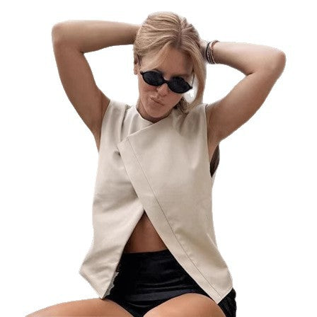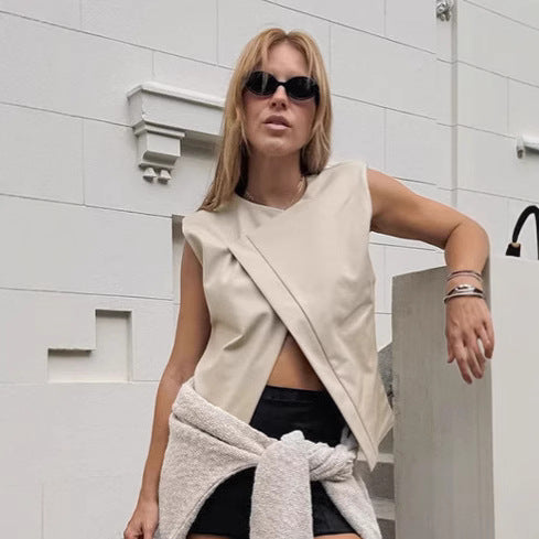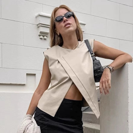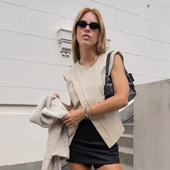 Design sense asymmetrical crew neck vest women's 2025 autumn fashion outside champagne sleeveless top women's clothing