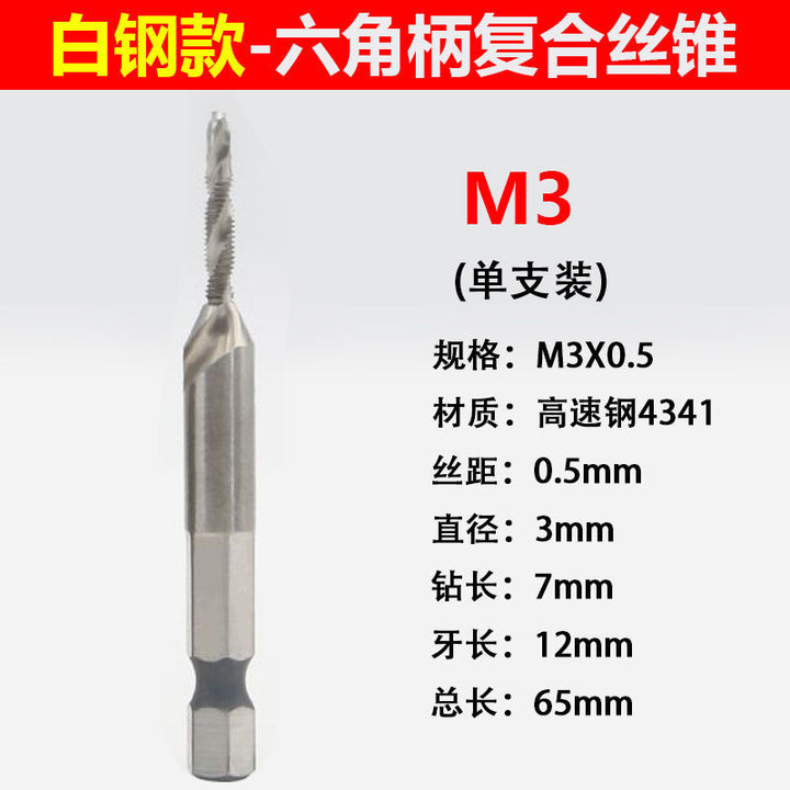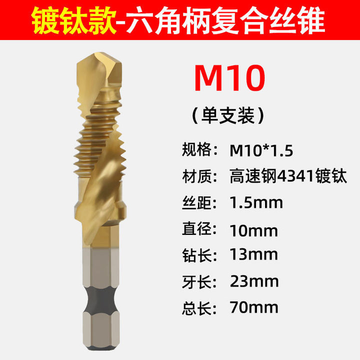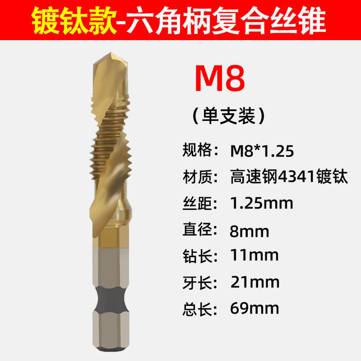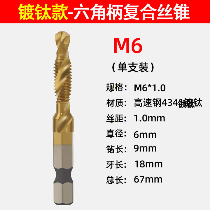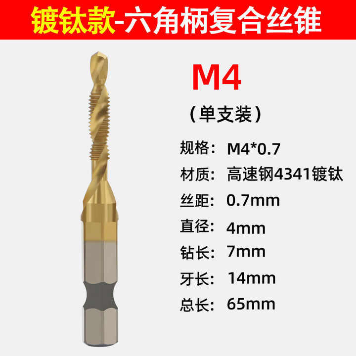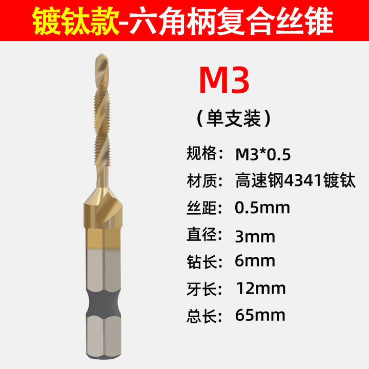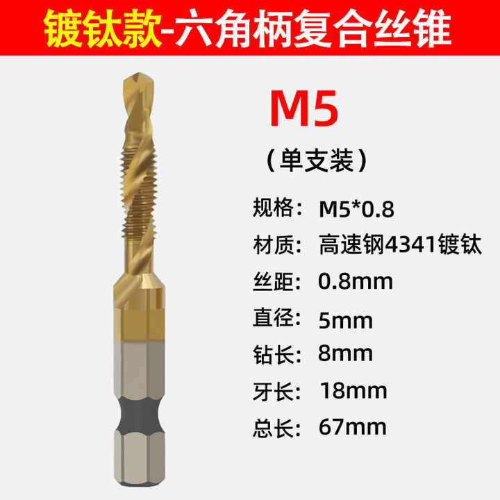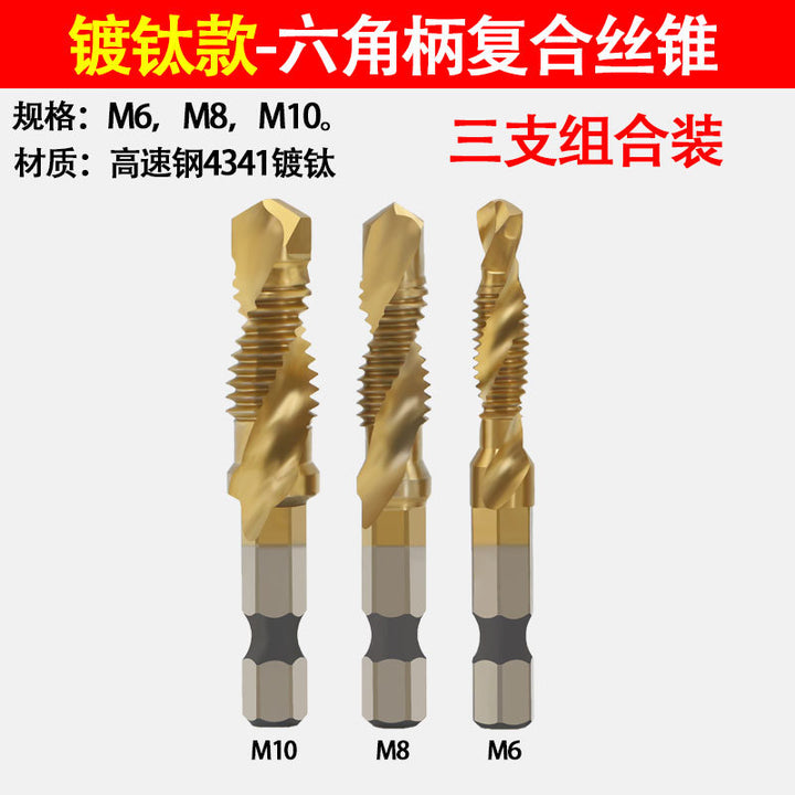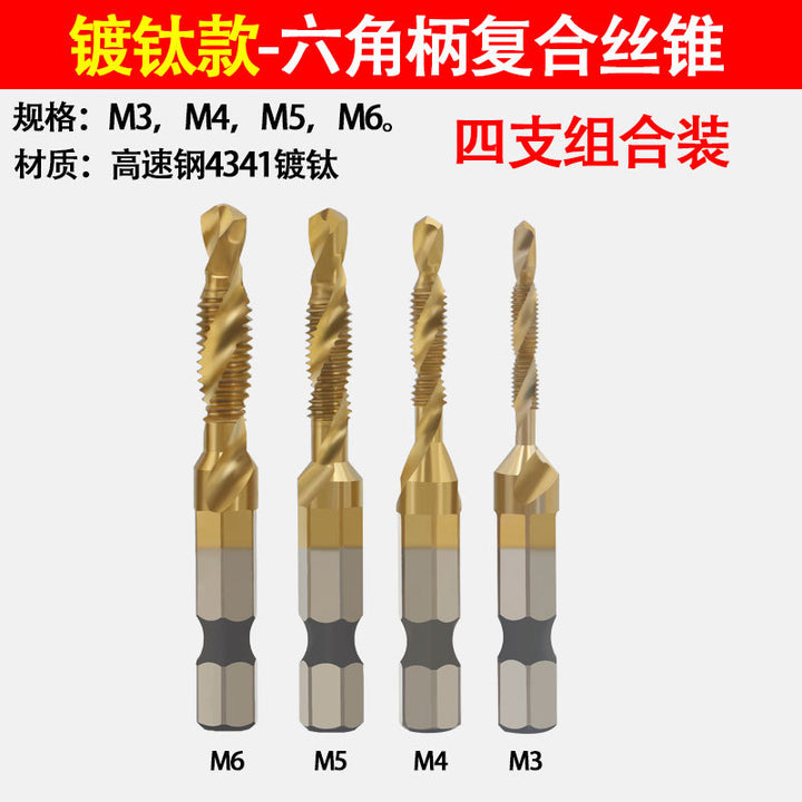Drilling and tapping machine with wire tapping, titanium-plated hexagonal handle composite tap thread opening electric drill bit tap set