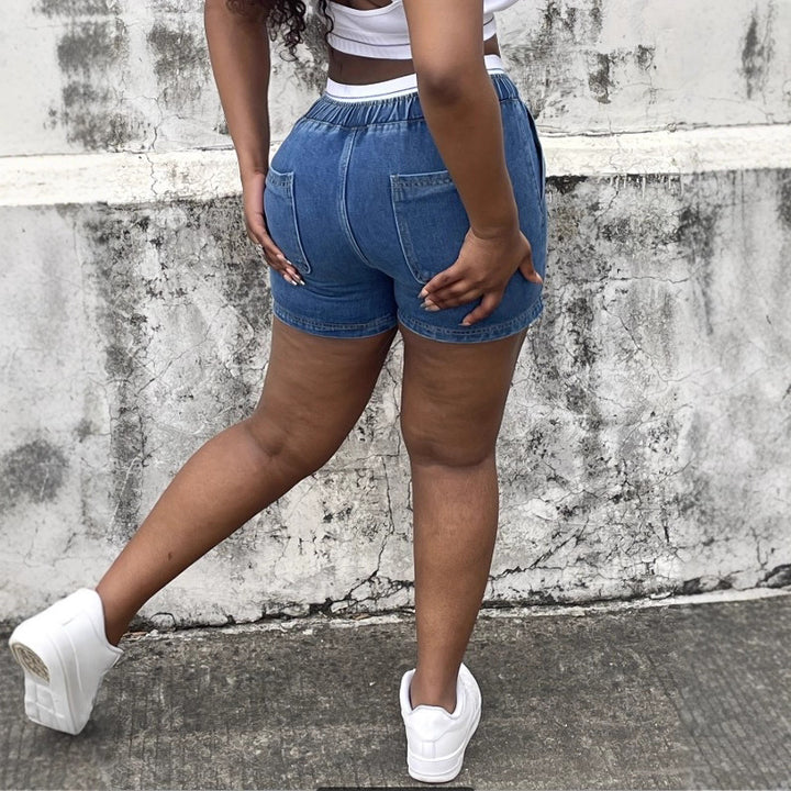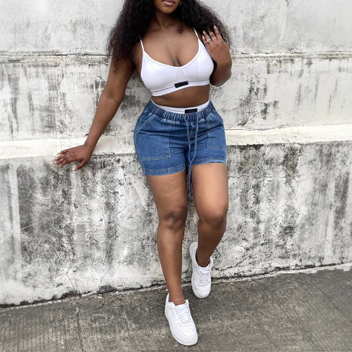 Europe and the United States special 2025 new women's elastic waist solid color shorts casual pants versatile drawstring denim shorts