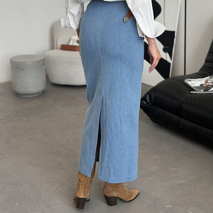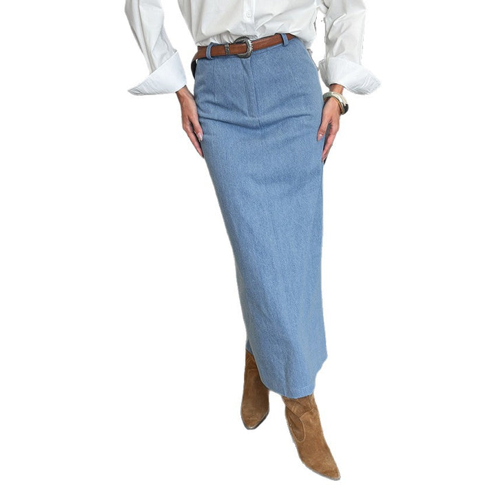 European and American 2025 autumn new blue denim skirt women's versatile slim-fit high-end split hip skirt