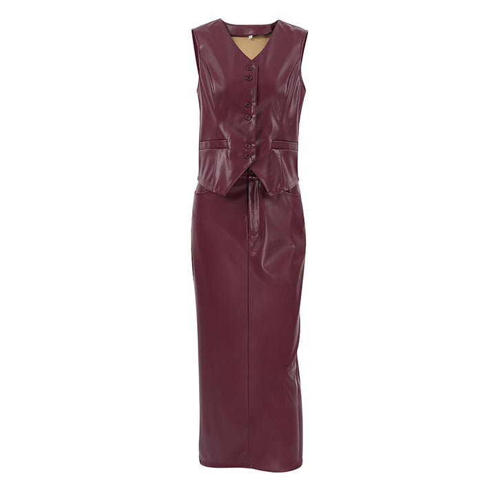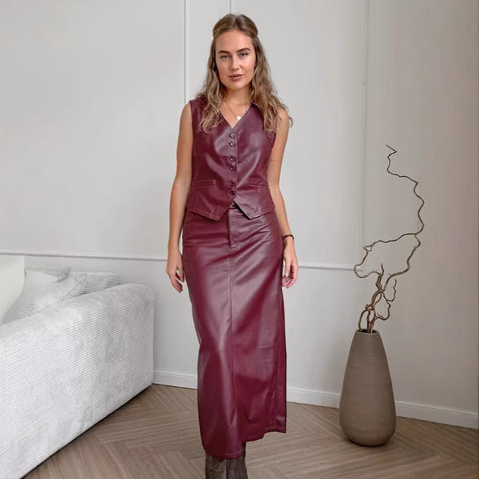 European and American Ankola red leather vest long dress two-piece set 2025 autumn and winter retro niche skirt set