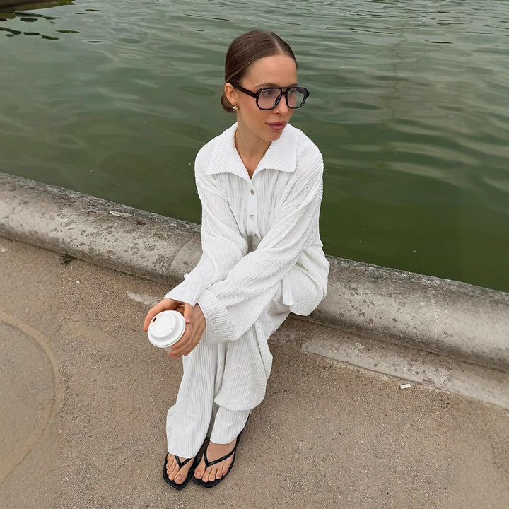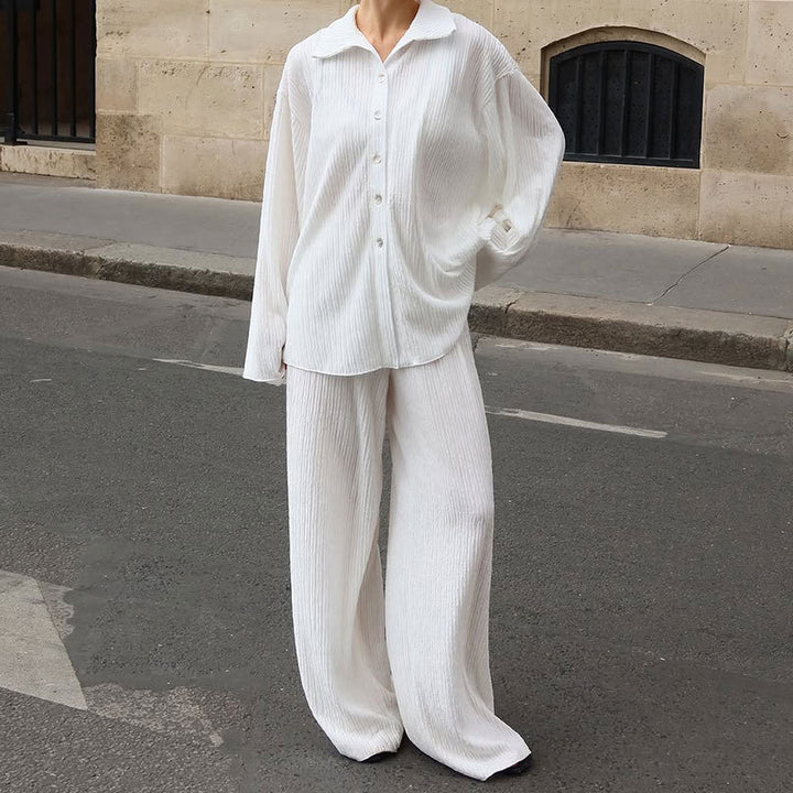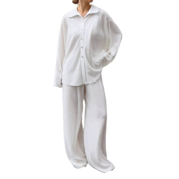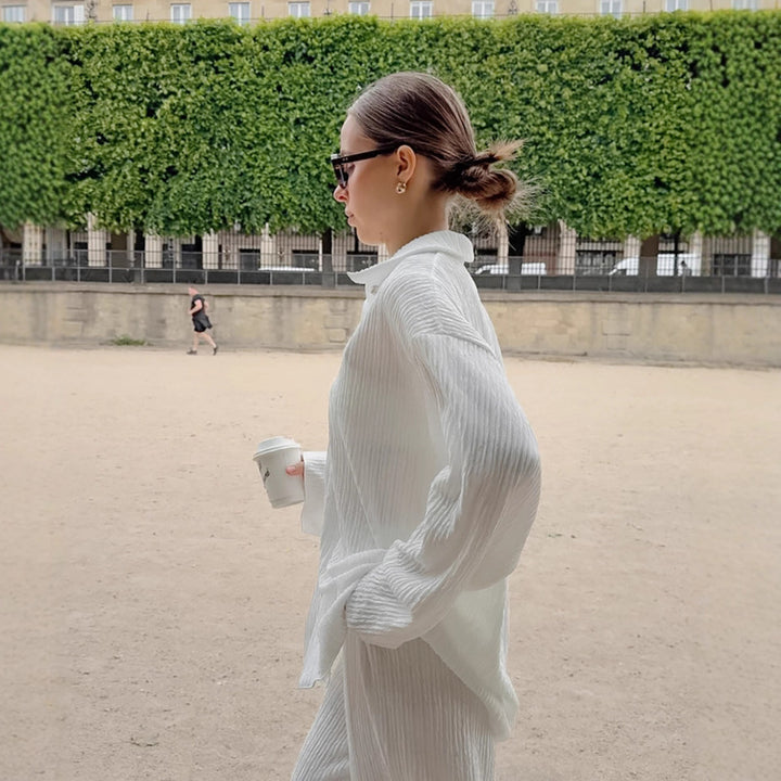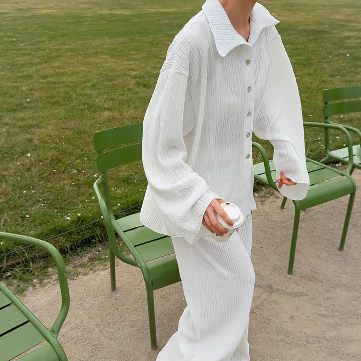 European and American autumn high-end white pleated shirt straight trousers two-piece fashion drape loose suit women's clothing