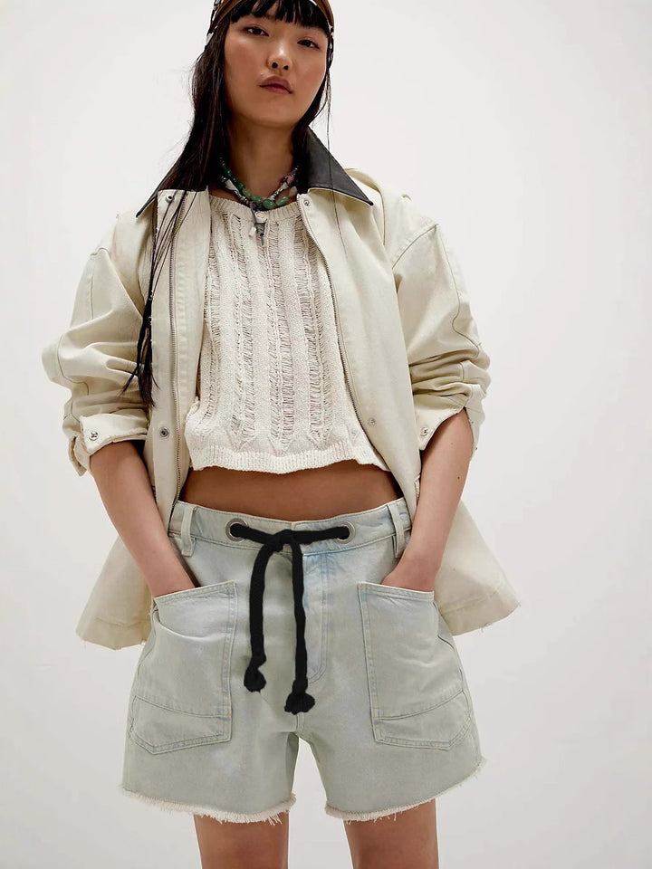 European and American casual corns drawstring multi-pocket loose denim shorts women and women si shorts women and women si