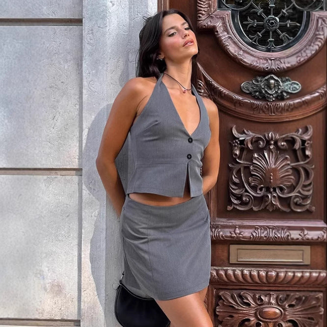 European and American commuter neck gray vest short skirt two-piece set women's 2025 summer professional wear temperament skirt set women's clothing