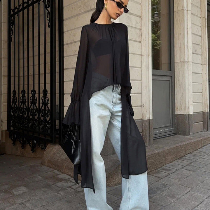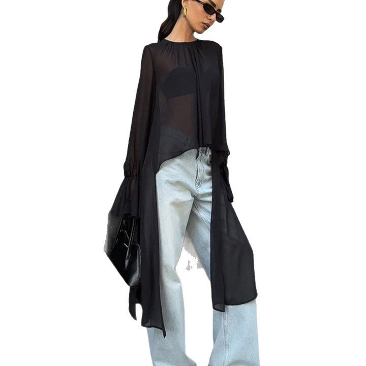 European and American commuter women's clothing black mesh irregular niche design sense round neck streamer lotus leaf sleeve long sleeve top