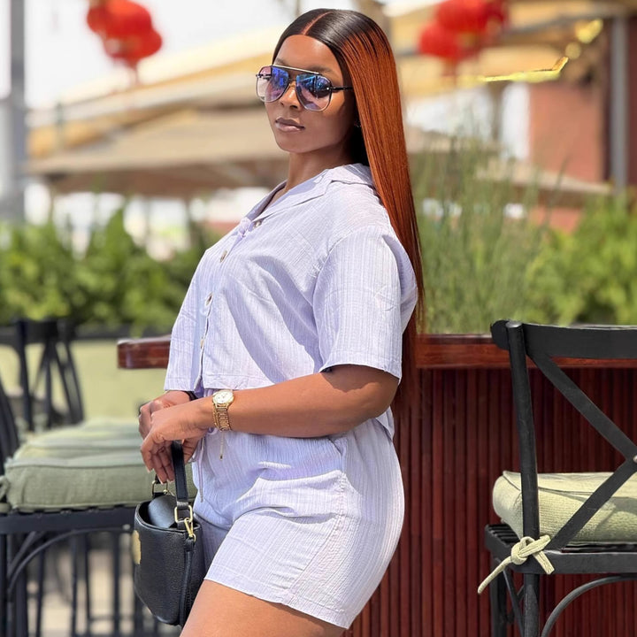 European and American fashion casual shorts set, short-sleeved lapel striped cardigan shirt, women's African new foreign style two-piece set