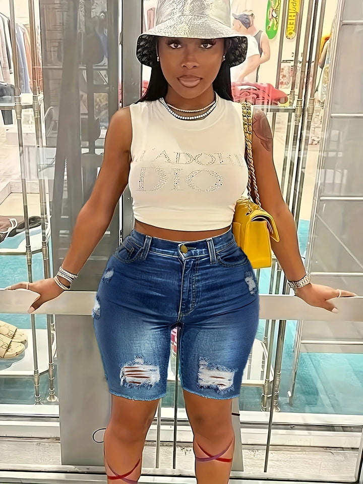 European and American , high-waisted slim-fitting ripped denim shorts for women