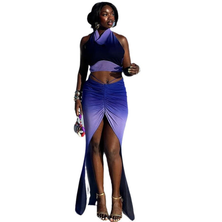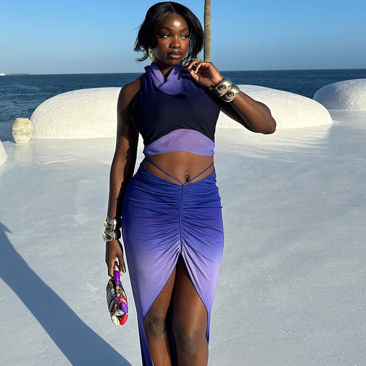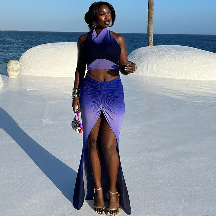 European and American ins women's fashion printed skirt set, sexy sleeveless backless small vest, split skirt two-piece set