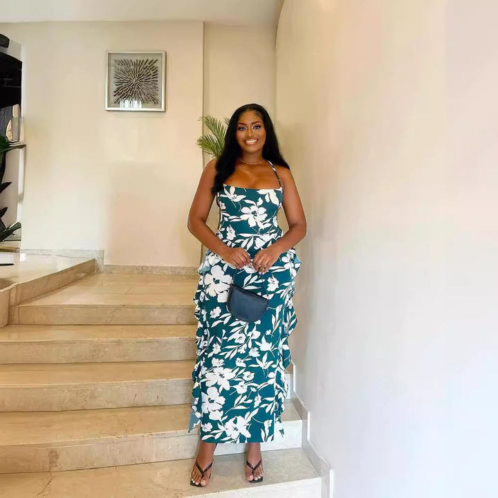 European and American ins women's fashion printed skirt set, sexy suspender halter strap belly pocket skirt set