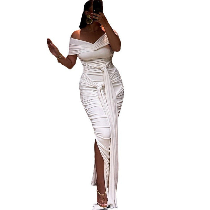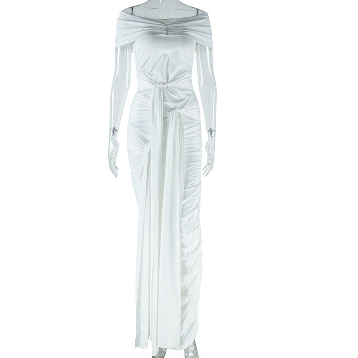 European and American ins women's solid color dress sexy one-word collar off-the-shoulder sleeveless streamer temperament split skirt dress