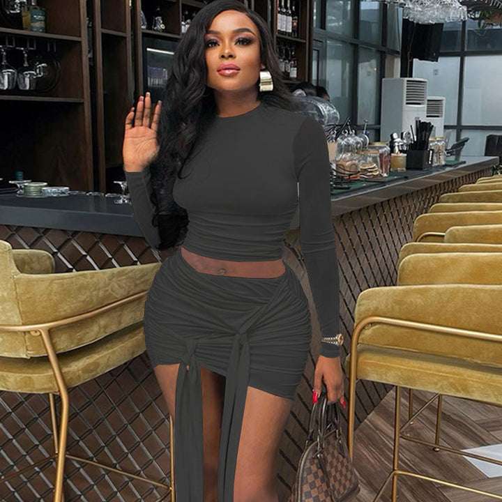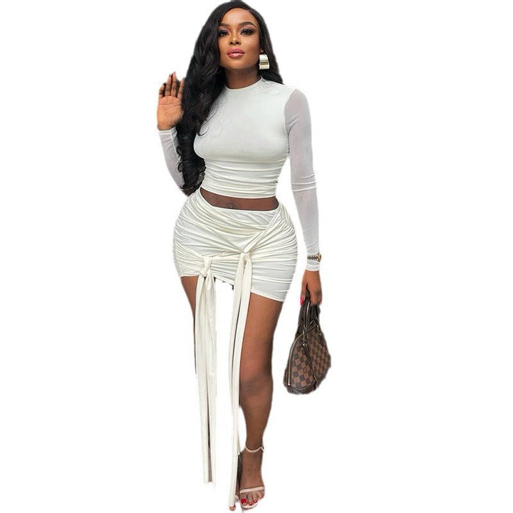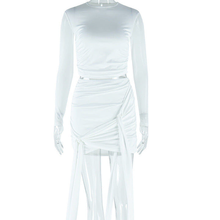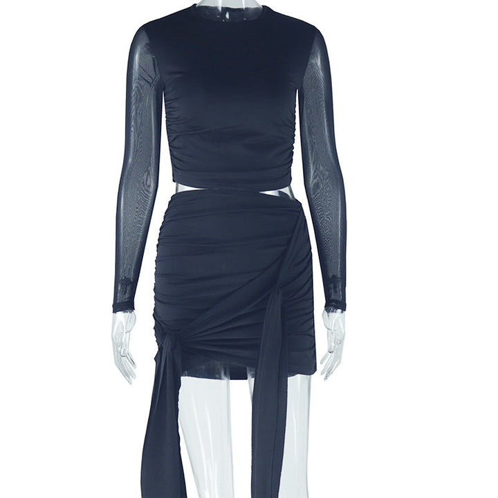 European and American ins women's solid color skirt set round neck mesh stitching open button top streamer skirt suits
