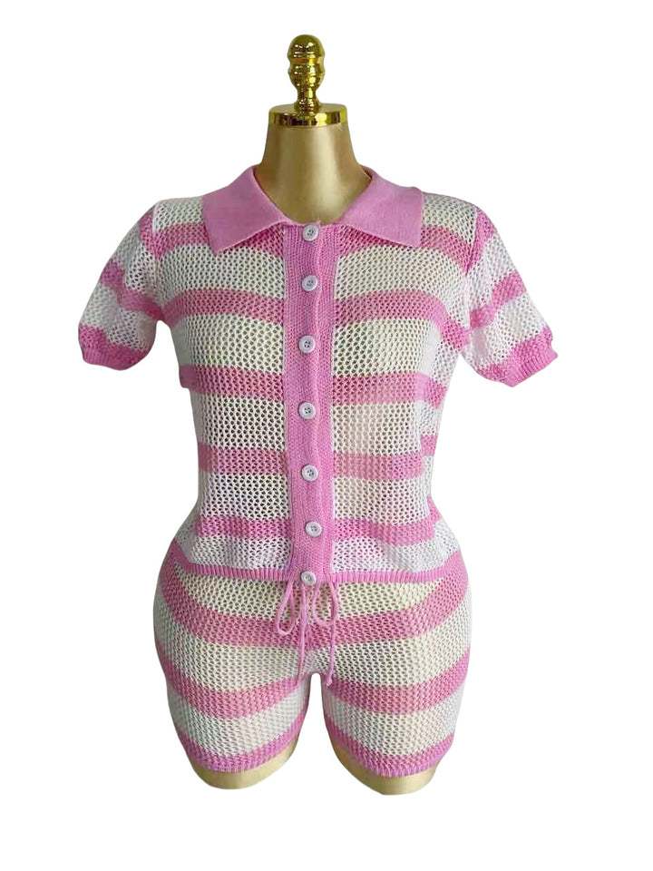 European and American knitted lapel retro striped loose version cardigan top high waist shorts women's beach pants set