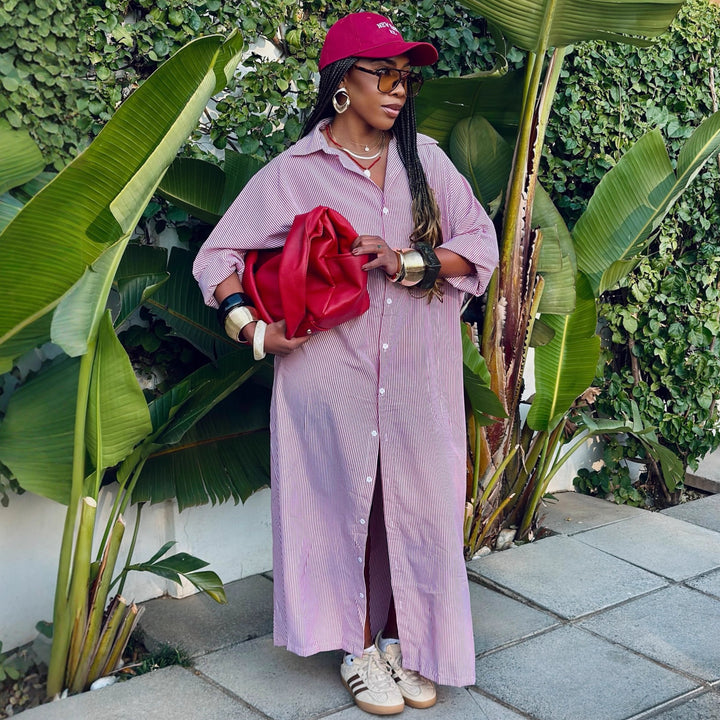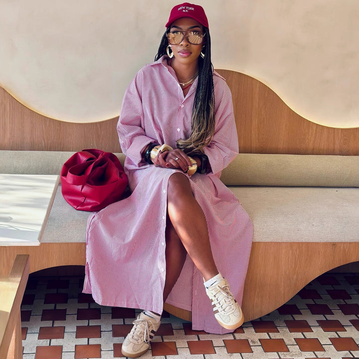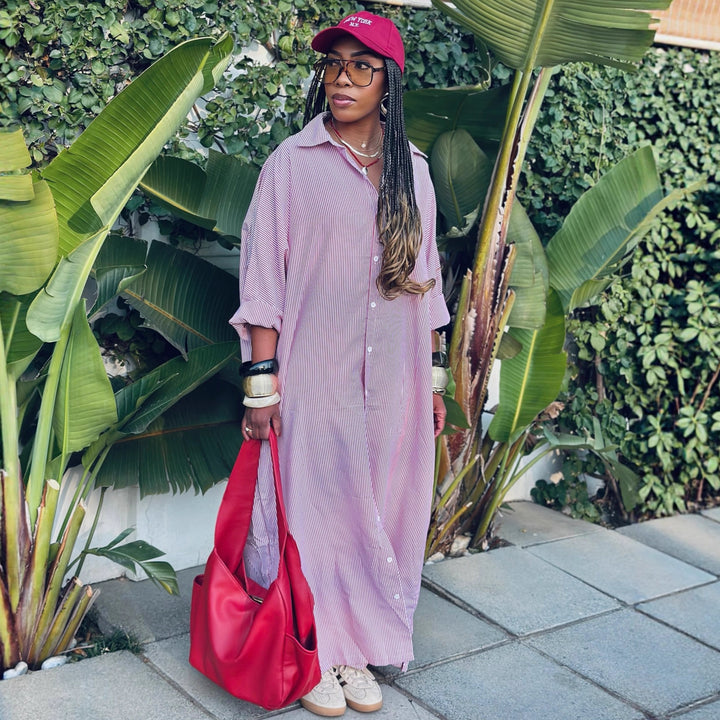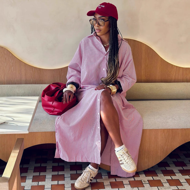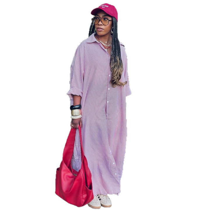 European and American large-size casual women's clothing, striped Polo collar single-breasted long dress, women's African loose and versatile long ...