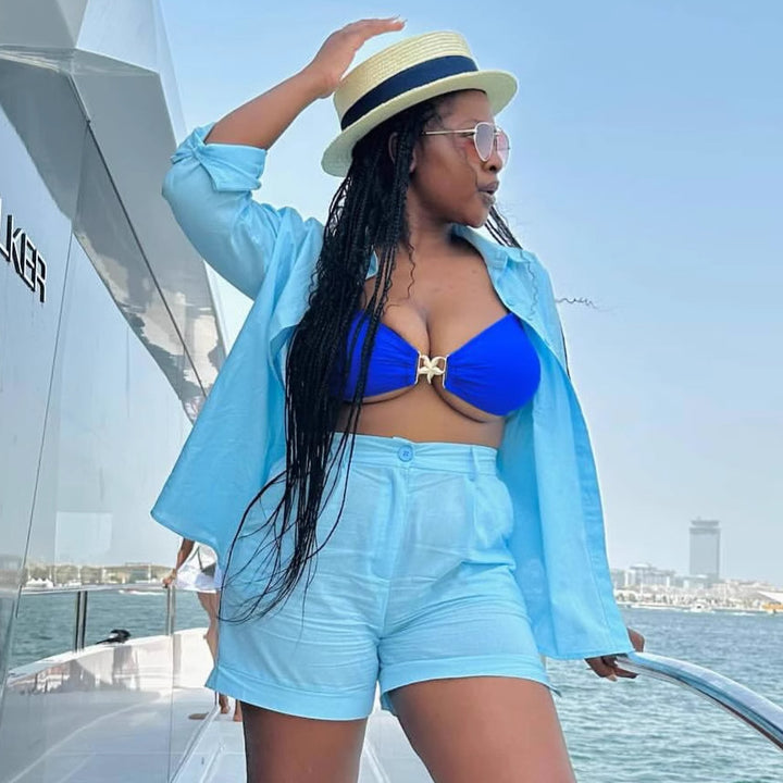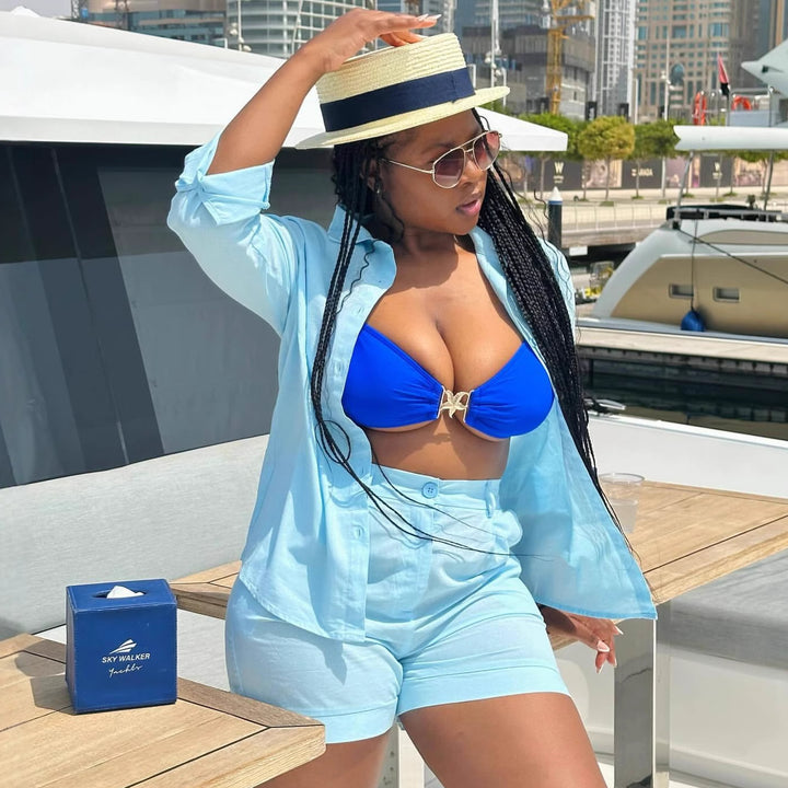 European and American large-size vacation style women's clothing set, solid color long-sleeved cardigan shirt, African casual shorts, new two-piece...