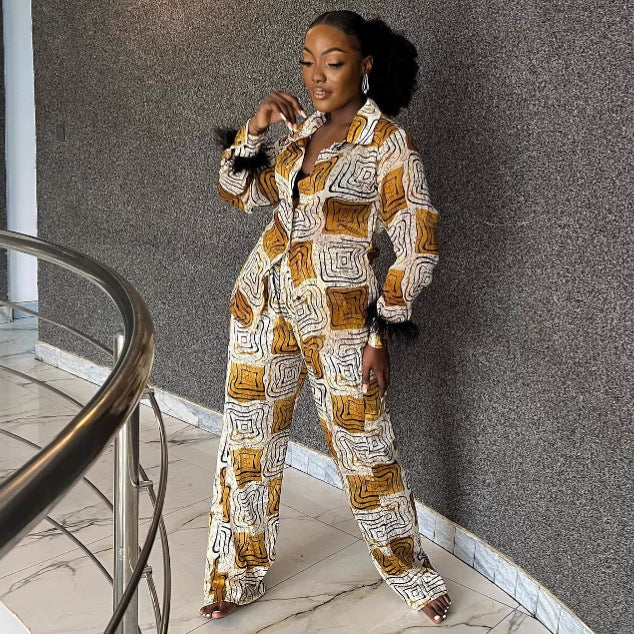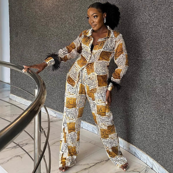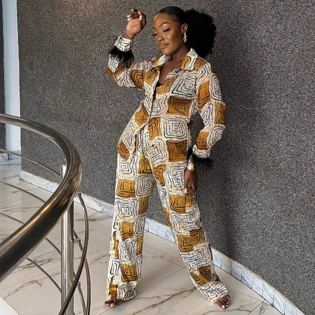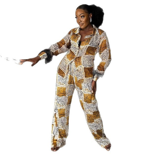 European and American large-size women's clothing long-sleeved printed lapel shirt top casual...