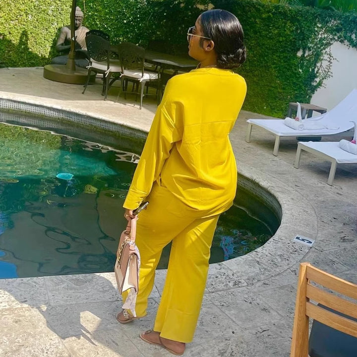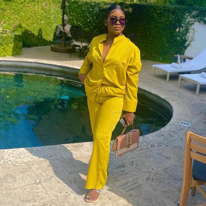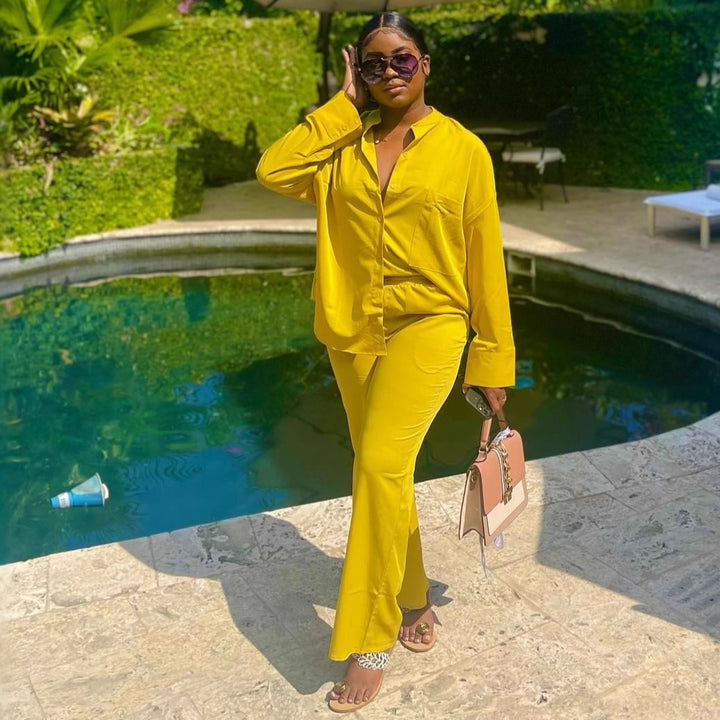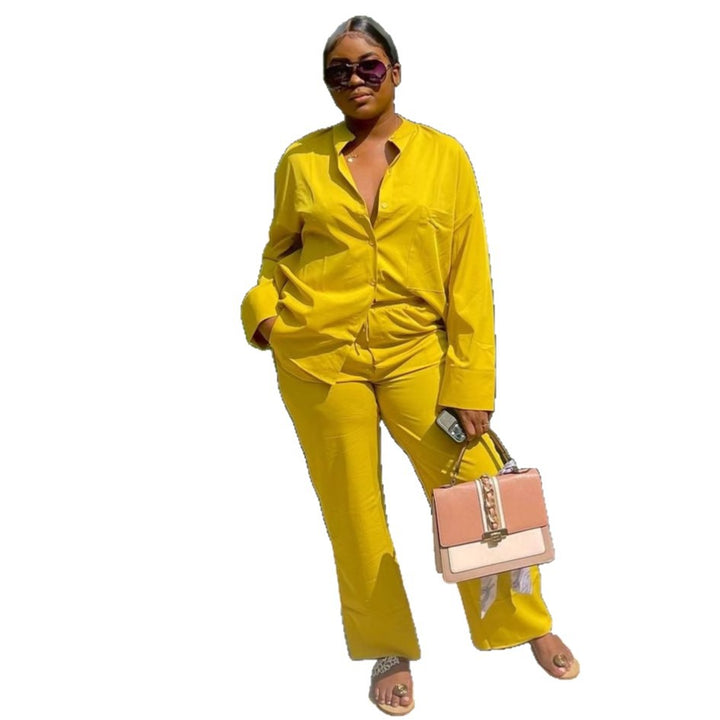 European and American large-size women's clothing solid color loose fashion lapel long-sleeved shirt African new casual trousers two-piece set women