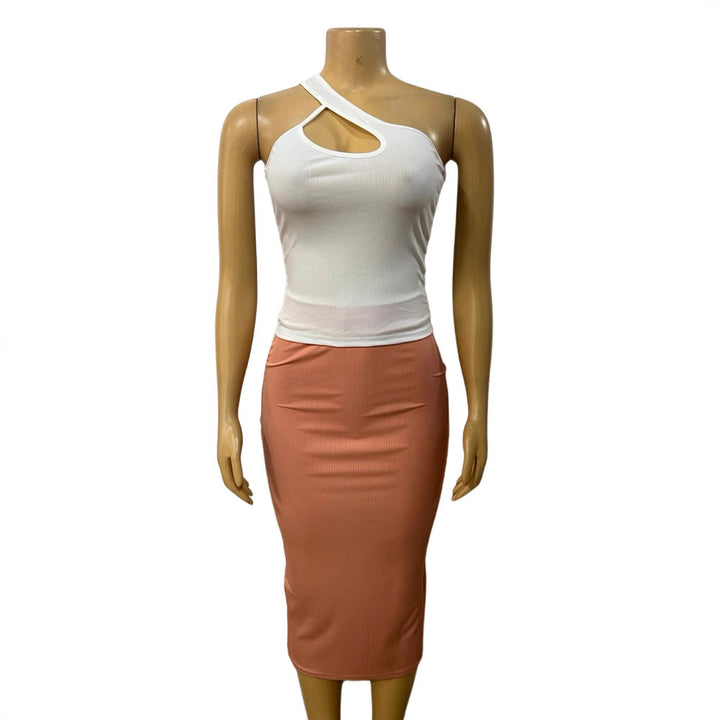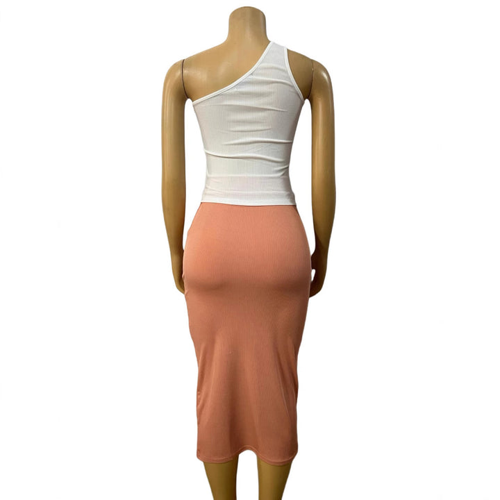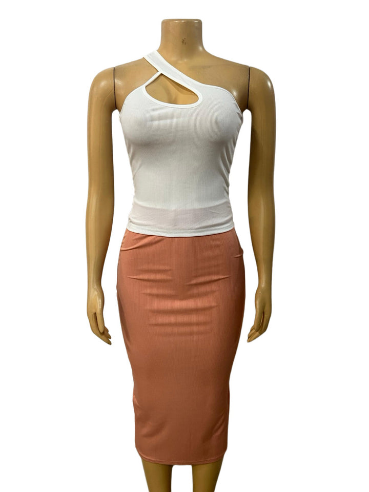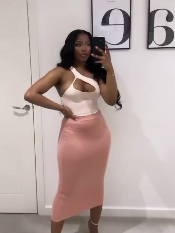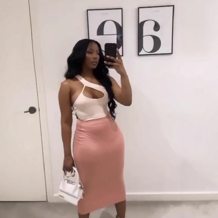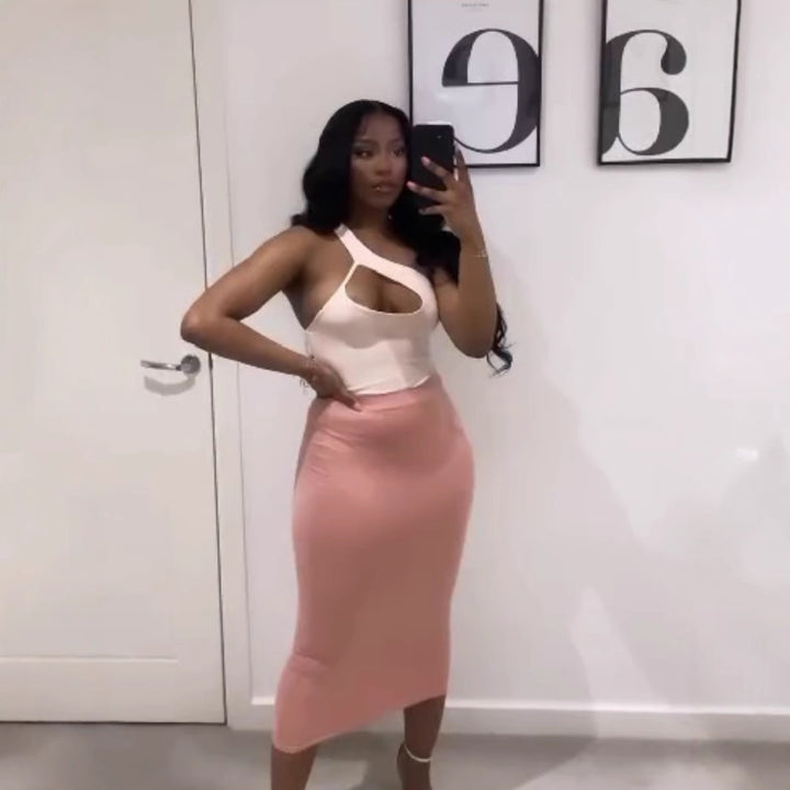 European and American new diagonal collar hollow low-cut sexy irregular top, hip-wrapped medium and long skirt set