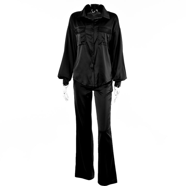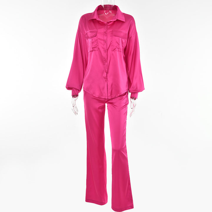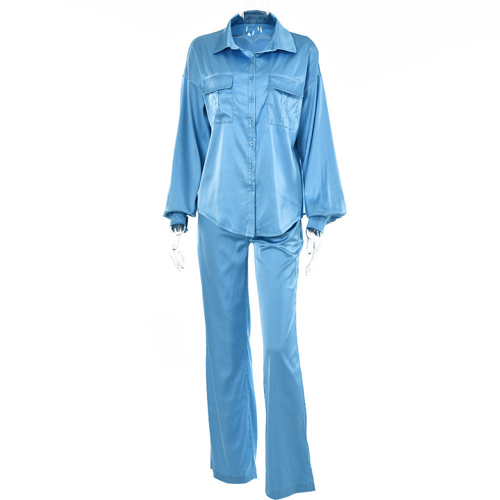 European and American new elegant light and mature wind loose two-piece set women's solid color button-down lapel top high-waisted straight pants set