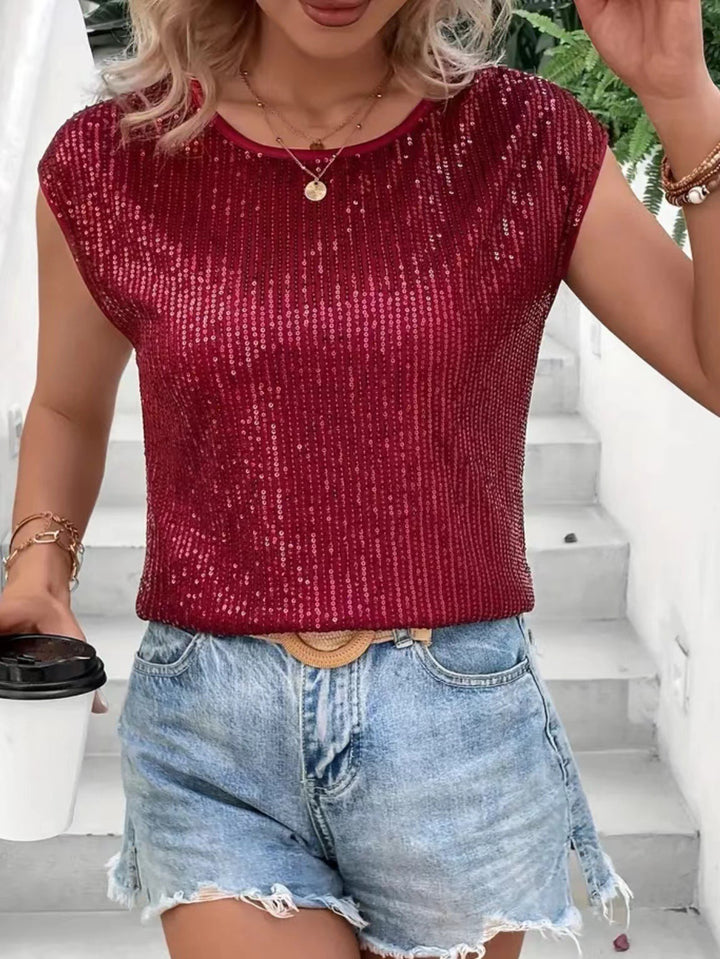 European and American new European and American style loose casual fashion party round neck sleeveless top women's sequined T-shirt