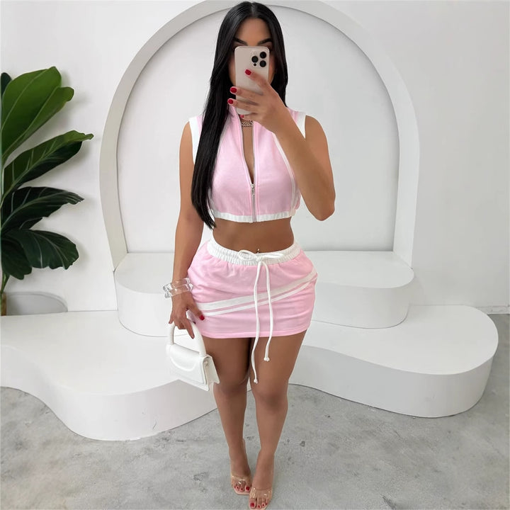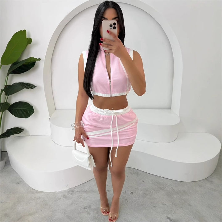 European and American new fashion slim-fit street zipper sleeveless open-button vest top, hip-wrapped lace-up short skirt set