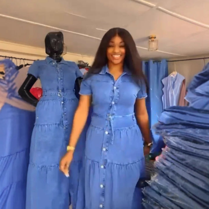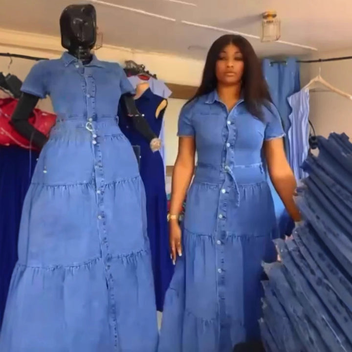 European and American new lapel button cardigan belt waist short-sleeved denim dress women's clothing