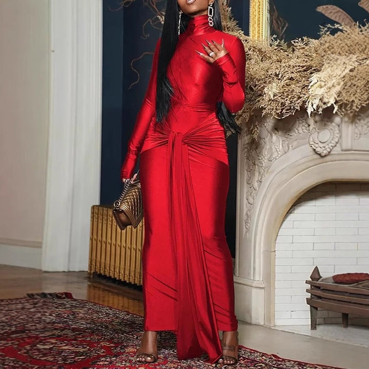 European and American new solid color sexy slim-fitting turtleneck long-sleeved lace-up streamer hip-wrapped dress women's clothing
