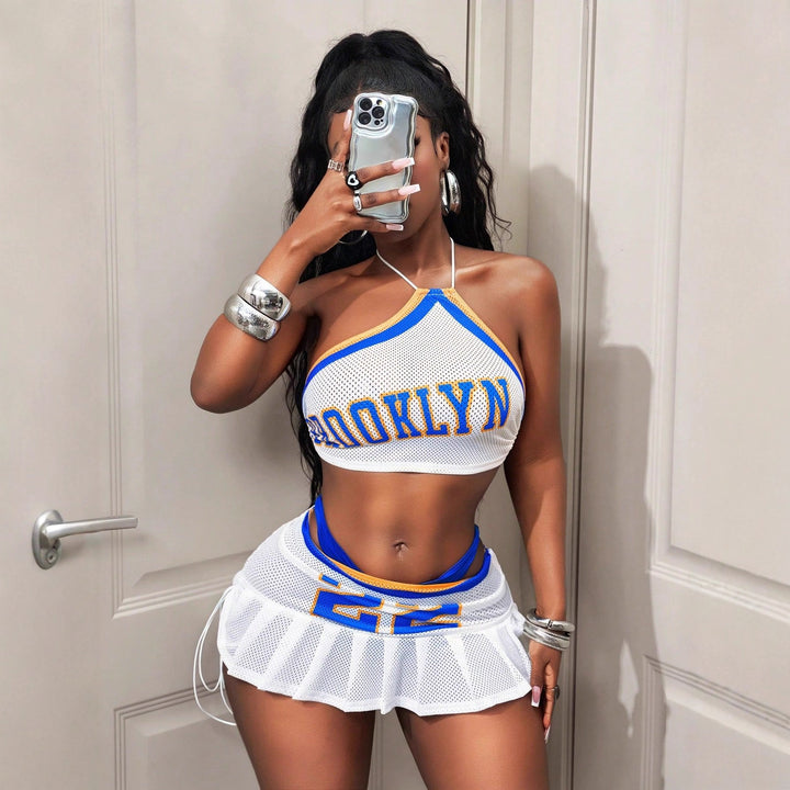 European and American new women's clothing fashion personalized neck-hanging sleeveless strap top sexy waist-length printed skirt set