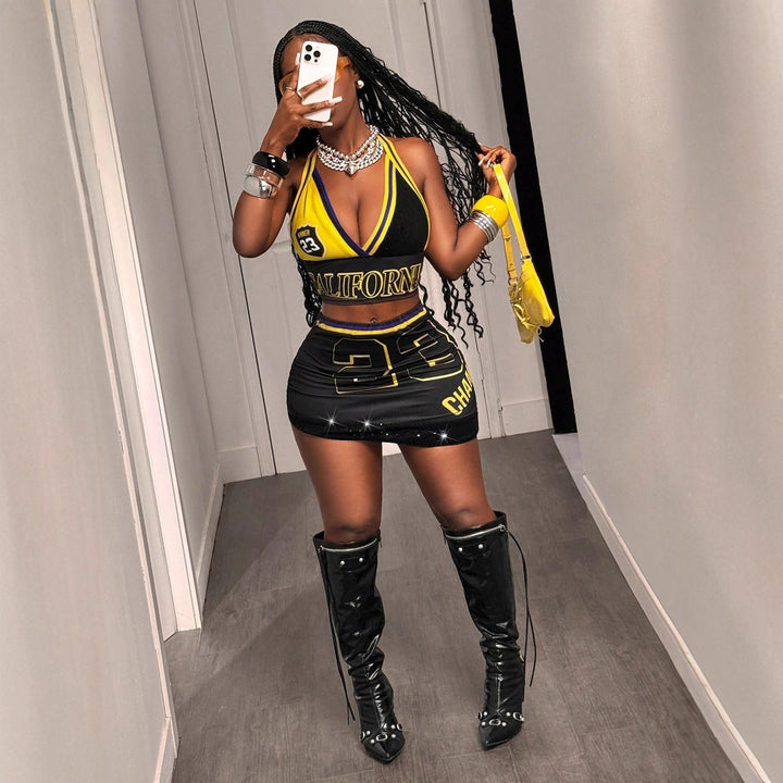 European and American new women's clothing sexy fashion trendy brand letter printing neck sleeveless top tight skirt set