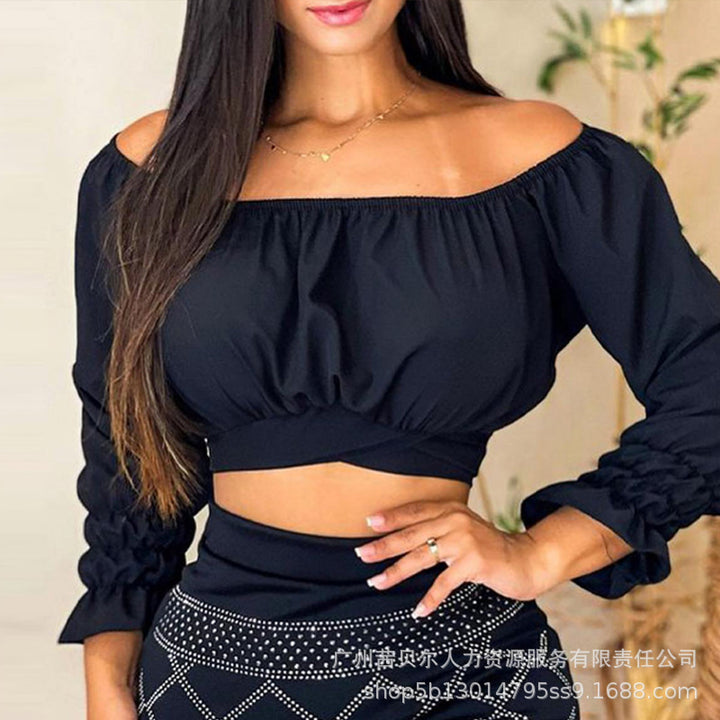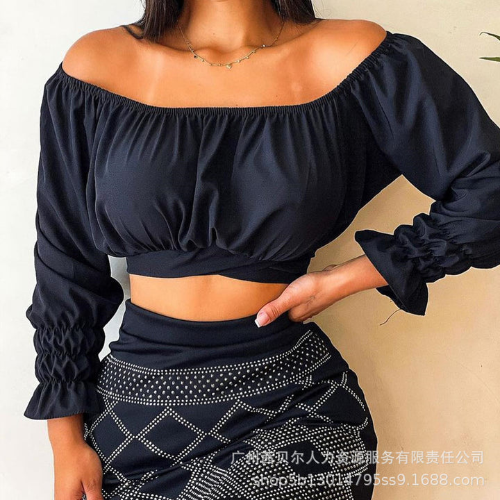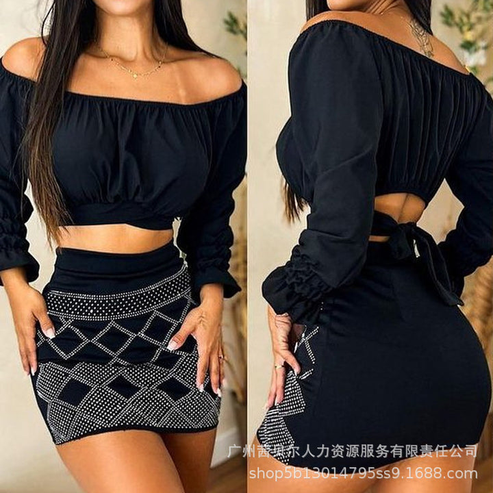 European and American new women's clothing solid color top + hot diamond skirt set 2-piece set LZJ2362