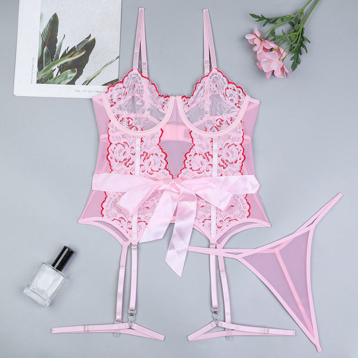 European and American pink lace sexy underwear cute pure desire wind bow big ribbon waist suspender two-piece set 3600