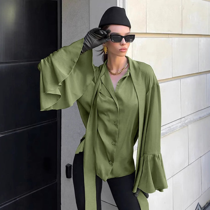 European and American ruffle edge satin top women's 2025 spring court style beige streamer shirt medium and long women's clothing