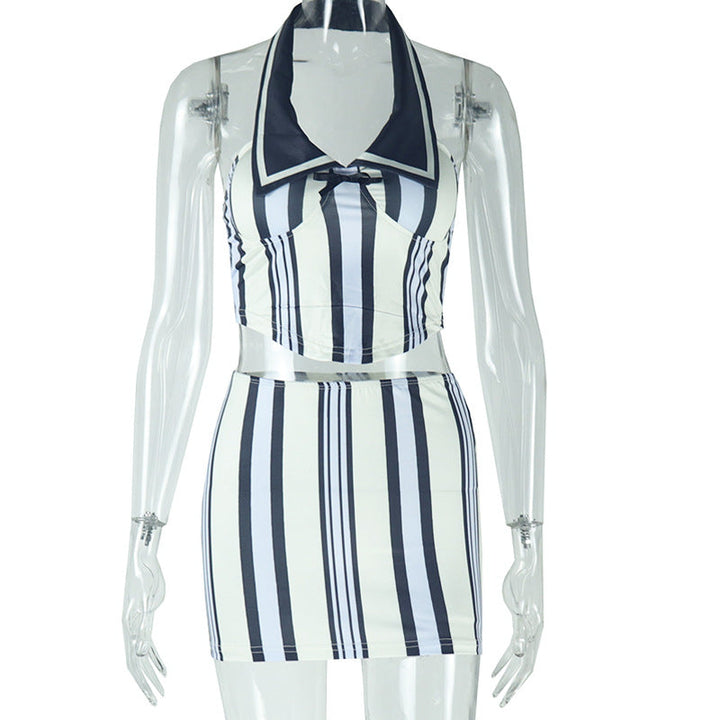 European and American style 2024 autumn new personalized digital printing sleeveless neck-hanging stripes contrasting color hip skirt set