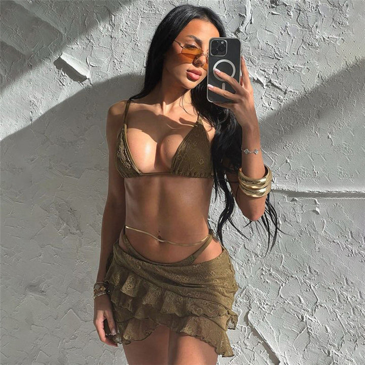 European and American style 2024 summer new sexy Spice Girl open button lace crochet strap bikini skirt set