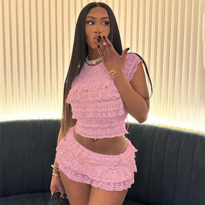 European and American style 2024 summer new solid color hollow street Spice Girl lace pleated slim-fitting navel pants set