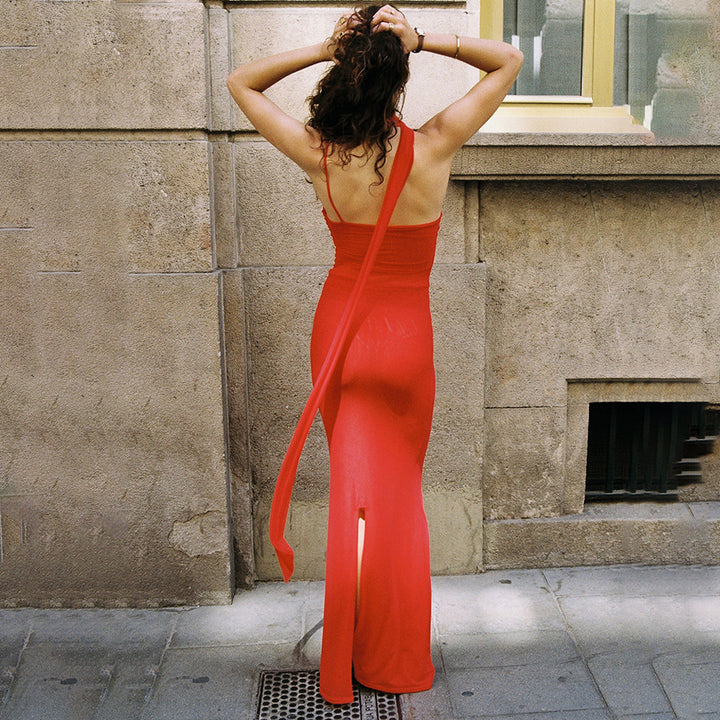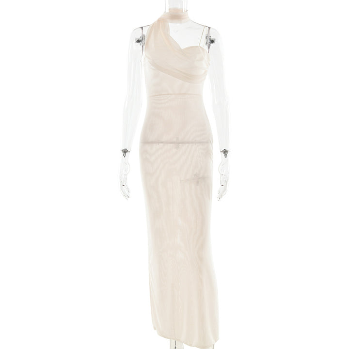 European and American style 2025 fashion streamer mesh sleeveless long dress new shrinkage pleated sexy backless slim dress