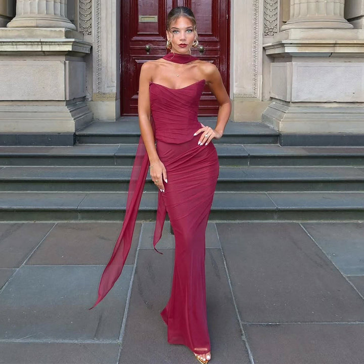 European and American style 2025 summer fashion new tube top strap-on neck high waist slim hip skirt set