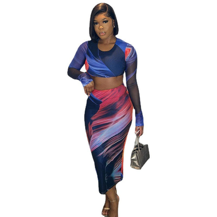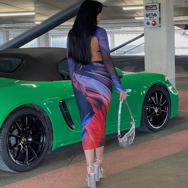 European and American style 2025 summer fashion printed top long sleeve halter strap hip skirt set skirt two-piece set women